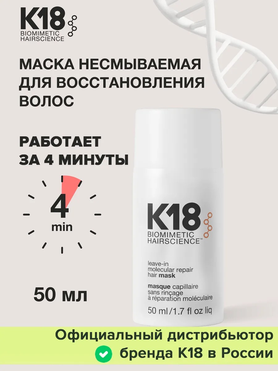 Несмываемая маска которая за 4 минуты профессионально восстанавливает волосы на молекулярном уровне благодаря патентованной технологии К18 Peptide. Оригинальная маска для волос k18 leave-in molecular repair hair mask - это первый продукт, использующий пептидный метод для восстановления кератиновых цепочек, разрушенных окрашиванием, обесцвечиванием и другими химическими процедурами.