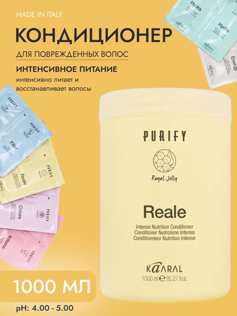 Восстанавливающий Кондиционер Purify Reale укомплектован ассортиментным пробником продукции Kaaral. Кондиционер обогащен пчелиным маточным молочком, превосходно ухаживает за кутикулой волос, питает их и устраняет признаки пористости. Делает волосы мягкими и шелковистыми, облегчая расчесывание, усиливает блеск. Предупреждает обезвоживание волос. Применение: на вымытые Шампунем Purify Reale влажные волосы нанести небольшое количество Кондиционера одноименной серии, в течение 3 минут эмульгировать на волосах, смыть водой. При склонности корней к зажириванию и для продления свежести прически, исключить нанесение средства на прикорневую область. Для удобства извлечения содержимого из банки применяйте фирменный дозатор (приобретается отдельно) - арт.5879187.
