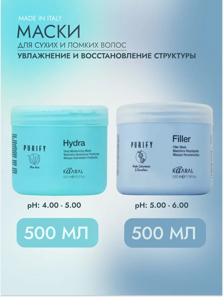 Kaaral's top professional hair care products, the Purify Hydra and Purify Filler masks, have been combined into a special set for fans of our brand who need to replenish their supply of effective masks at an attractive price.