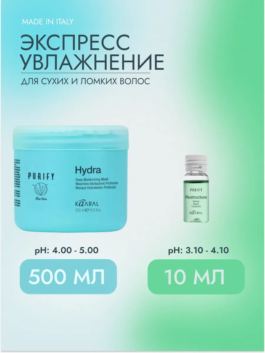 Purify Hydra Mask is designed for intensive hair hydration and comes in a set with a 10ml ampoule of Purify Restructure lotion. The mask is enriched with aloe vera, which improves moisture retention by delivering moisturizing ingredients to the hair. A blend of cumin, sesame, sunflower, and vitamin E oils provides a highly nourishing effect, enriching hair with vitamins, amino acids, and essential fatty acids while neutralizing free radicals. Hair becomes shiny, hydrated, and renewed. Directions: Apply the mask to washed, damp hair, distribute through the lengths, and leave on for 3-5 minutes. Rinse thoroughly. Use 1-2 times a week. Apply the contents of one ampoule to clean, towel-dried hair. Apply the product along the entire length of the hair, leave it on for no more than 5 minutes on blonde hair (up to 7 minutes for darker shades), and then rinse with water. Combinations of the mask and lotion are individualized based on hair needs.