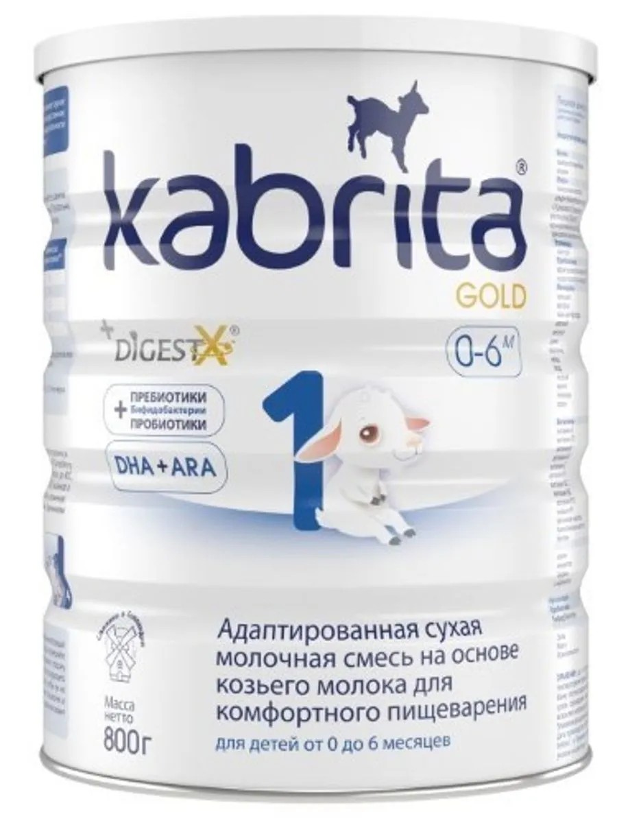 Kabrita 1 Gold goat milk powder formula for comfortable digestion 800.0. Goat milk and milk-based products are easily digested and tolerated. This promotes comfortable digestion for the baby. Kabrita formulas provide balanced, complete, and gentle nutrition from birth. For children from 0 to 6 months: skim goat's milk, lactose, vegetable oils (coconut oil, low-erucic rapeseed oil, sunflower oil), digestx (1,3-dioleoyl 2-palmitoyl triglyceride), goat's milk whey protein concentrate, galactooligosaccharides, fructooligosaccharides, vitamin and mineral premix, fish oil (source of DHA), choline bitartrate, arachidonic acid, l-phenylalanine, taurine, inositol, nucleotides, l-carnitine, bifidobacteria (bifidobacterium bb-12*). Does not contain crystalline sugar.