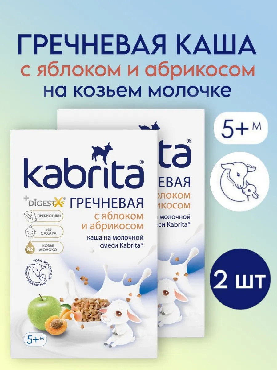 Нежная гречневая каша детская молочная Kabrita на адаптированной детской молочной смеси на основе козьего молока с добавлением полезного яблока и абрикоса. Приготовлена на основе детской молочной смеси из козьего молока с добавлением комплекса DigestX и пребиотиков, что обеспечивает комфортное пищеварение. Частично гидролизованные злаки в сочетании со смесью для детского питания придают каше особую нежность, сладкий вкус и облегчают переваривание. Идеально подходит для сбалансированного питания малыша первого года жизни и расширения его вкусовых предпочтений.