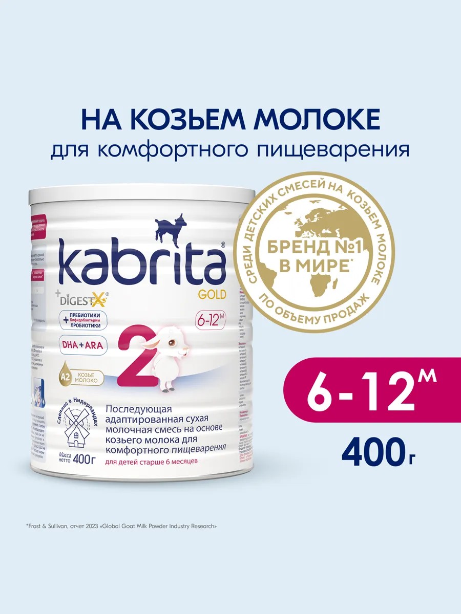 Kabrita 2 GOLD – адаптированная нежная молочная смесь для новорожденных на основе козьего молока для комфортного пищеварения для детей от 6 до 12 месяцев. Смесь Кабрита ГОЛД разработана как альтернатива грудному молоку, а также может применяться в качестве подкормки малышей. Она производится из натурального козьего молока с добавлением сывороточных белков козьего молока.
