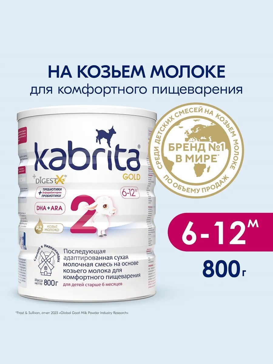 Kabrita 2 GOLD – адаптированная нежная молочная смесь для новорожденных на основе козьего молока для комфортного пищеварения для детей от 6 до 12 месяцев. Смесь Кабрита ГОЛД разработана как альтернатива грудному молоку, а также может применяться в качестве подкормки малышей. Она производится из натурального козьего молока с добавлением сывороточных белков козьего молока.