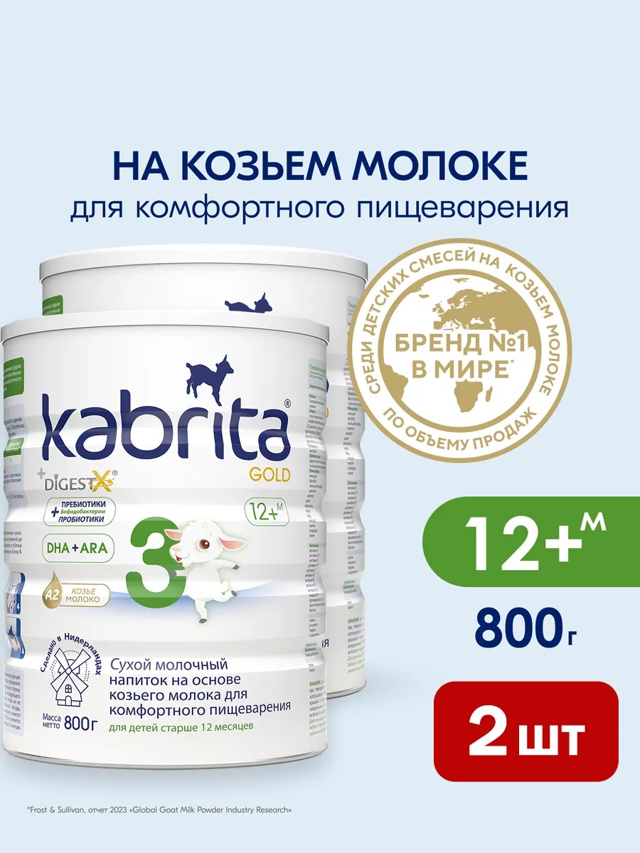 Kabrita 3 GOLD – адаптированная нежная молочная смесь на основе козьего молока для комфортного пищеварения детей от 1 до 1,5 лет. Смесь Кабрита ГОЛД разработана как альтернатива грудному молоку, а также может применяться в качестве подкормки. Она производится из натурального козьего молока с добавлением сывороточных белков козьего молока.