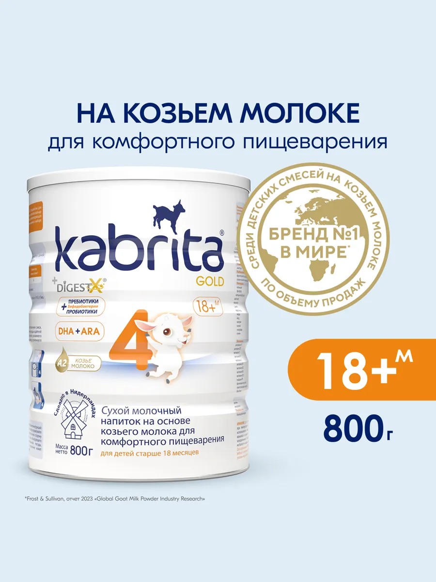 Kabrita 4 GOLD – адаптированная нежная молочная смесь на основе козьего молока для комфортного пищеварения детей от 1,5 до 2 лет. Смесь Кабрита ГОЛД разработана как альтернатива грудному молоку, а также может применяться в качестве подкормки. Она производится из натурального козьего молока с добавлением сывороточных белков козьего молока.