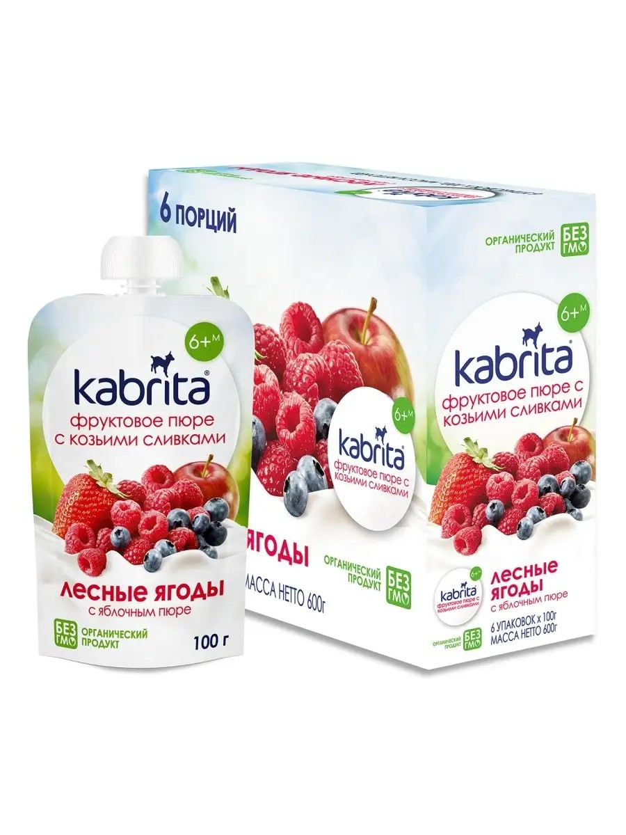 Пюре фруктовое детское Кабрита из органических фруктов и ягод с добавлением нежных сливок козьего молока. Детское пюре Kabrita приготовлено без сахара, без крахмала, без консервантов, без вкусовых добавок и ГМО, без глютена. Прекрасное лакомство на любой случай, которое удобно брать с собой. Пюре в мягкой упаковке – идеальное решение для прогулок и перекуса как для малышей, так и для детей более старшего возраста. Пюре детское в мягкой упаковке можно взять в машину: в дорогу или в путешествие. Удобная и опрятная мягкая упаковка способствует развитию мелкой моторики малыша и навыков самостоятельности.