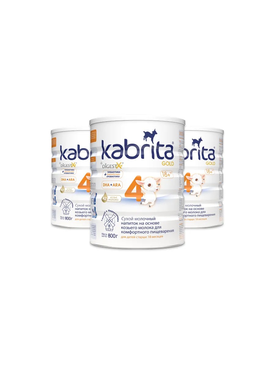 Kabrita 4 GOLD - нежное и вкусное детское молочко на основе натурального полезного козьего молока для здоровых детей с 18 месяцев. Kabrita 4 GOLD производится из полезного козьего молока с добавлением комплекса DigestX, пребиотиков (ФОС, ГОС), пробиотиков (бифидобактерии Bifidobacterium Animalis), DHA и ARA, нуклеотидов. В период активного роста и развития малышу особенно необходимо здоровое и сбалансированное питание, удовлетворяющее возросшие потребности ребенка этого возраста. Всего две порции Kabrita 4 GOLD в день содержат 58% кальция, 68% железа и 54% витамина D (% от суточной потребности).