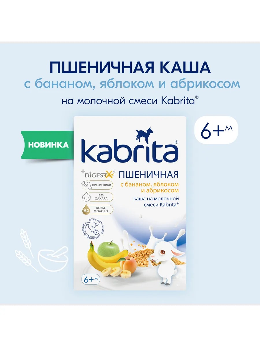 Tender and airy wheat porridge based on Kabrita formula with the addition of ripe, delicious fruits is ideal for balanced nutrition for babies in their first year of life and for expanding their taste preferences.