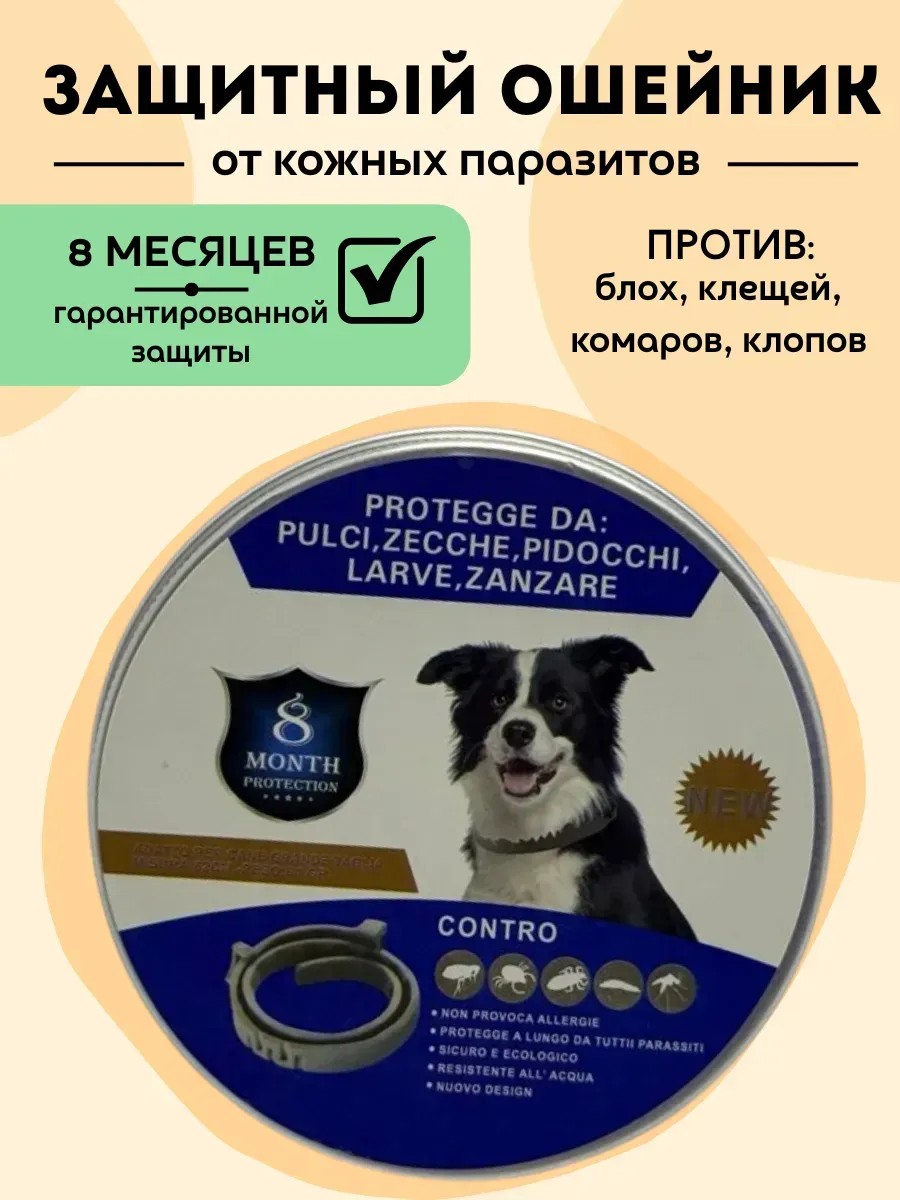 This flea and tick collar for dogs and puppies provides reliable protection for your pet against dangerous parasites year-round. Its special insecticidal formula begins working within 1-2 hours of application, killing fleas, ticks, and lice, and repelling other blood-sucking insects. Thanks to its long-lasting effect, the collar provides protection for up to 8-9 months without additional treatment. Suitable for puppies and adult dogs of all breeds, it's easily adjustable and comfortable. The soft, hypoallergenic material is safe even for sensitive animals. The collar is water-resistant, so it doesn't need to be removed during bathing or rainy walks. It's a great alternative to drops and sprays: odorless, won't stain fur or skin, and doesn't require daily use. Ensure your pet's comfort and safety with this effective and convenient anti-parasitic collar.