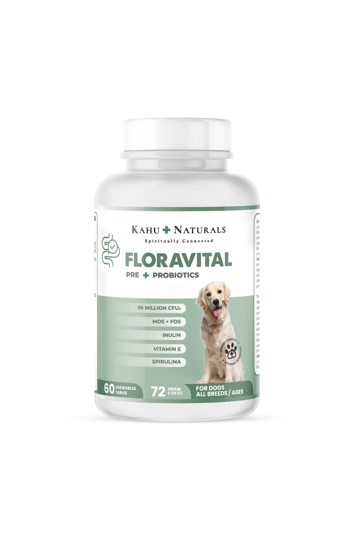 • KahuNaturals FloraVital,is a complementary food containing probiotics and prebiotics specifically developed for small, medium, and large breed dogs to support and maintain gastrointestinal health.