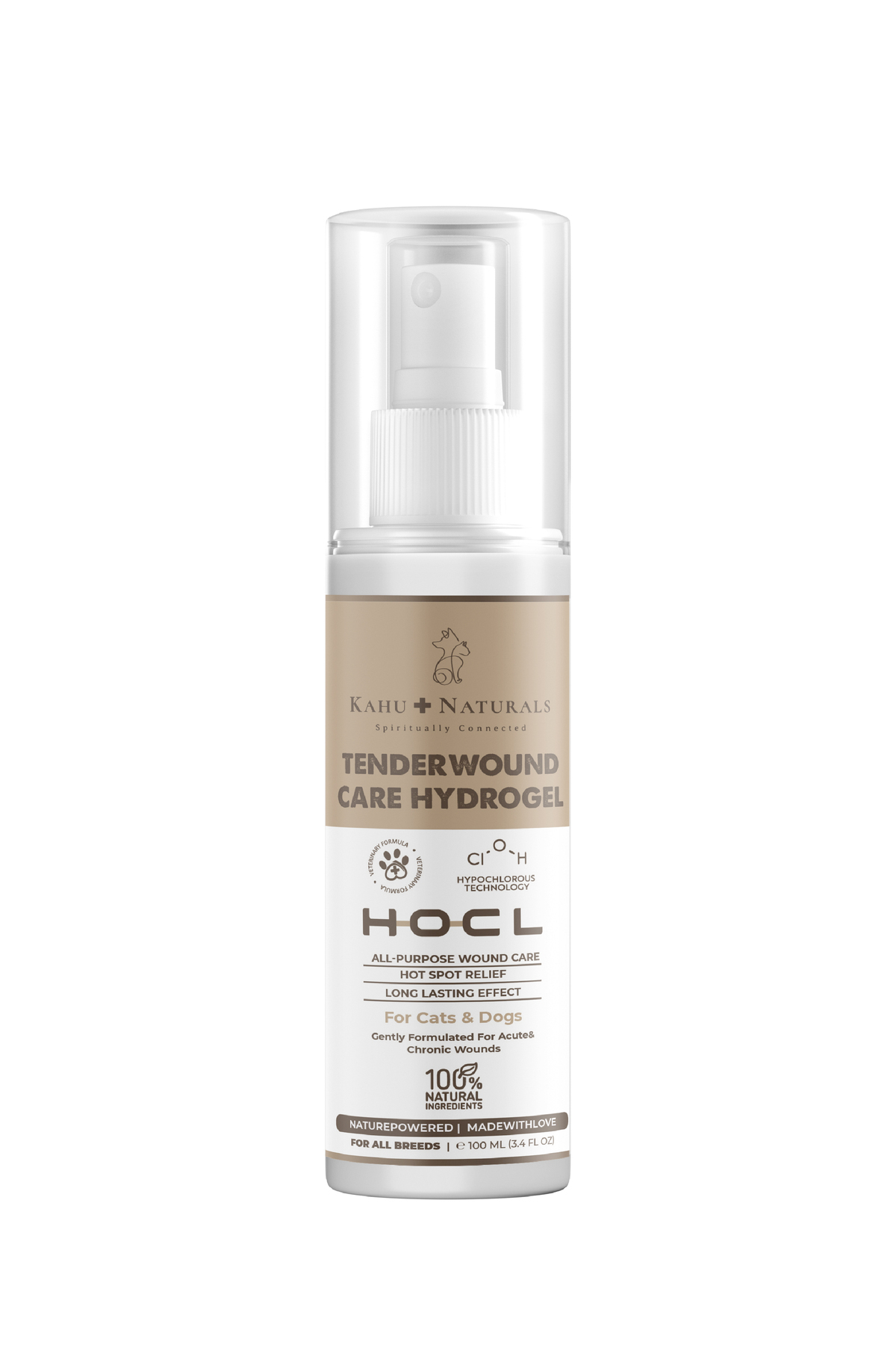 • KahuNaturals TenderWound Care,pH-balanced, non-irritating wound and skin care gel produced with hypochlorous technology, can be used safely on cats and dogs at all life stages, including around the mouth, nose, ears, and eyes. It maintains proper moisture balance during all stages of wound healing. It is non-toxic or non-irritating. It helps relieve itching and pain associated with skin irritations. It does not damage or irritate cells, and it does not cause a burning sensation in open wounds. It does not disrupt the natural pH balance of our furry friends.