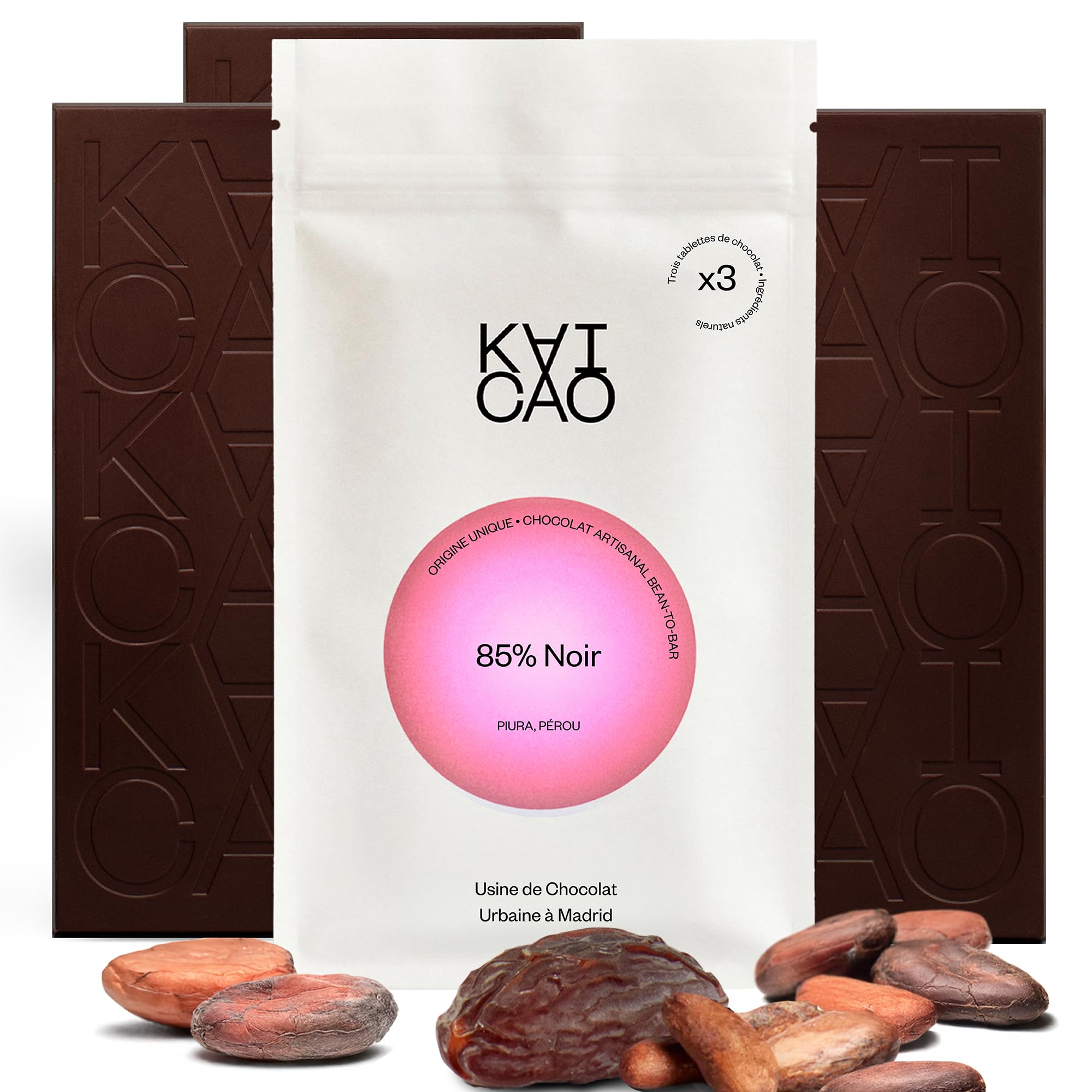 DEEP INTENSITY Discover the richness of dark chocolate 85 fine cocoa flavor, without refined sugar, from Piura, Peru. Appreciated for its deep aromatic profile and unique fruity notes, this chocolate offers a taste experience pure and intense. CHOCOLATES TO OFFER Perfect for dark chocolate lovers preferring an authentic and less sweet experience, highlighting the quality of Peruvian cocoa. Ideal as a gift, it is rich in antioxidants and provides essential minerals such as iron, magnesium and zinc. SWEET WITH DATES Concerned about health and well-being, our dark chocolate is naturally sweetened with dates, without the addition of refined sugar. This method preserves the purity and intensity of the cocoa taste, for a natural and authentic tasting experience. RESPONSIBLE MANUFACTURING Our fine flavor cocoa beans are sourced from small farmers located along the arid northern coast of Piura, Peru, in a tropical dry forest ecosystem. It is here that the finest cocoa is grown, capturing the essence of this unique terroir. Each Kaicao 85 dark chocolate bar is an ode to taste and supports sustainable agricultural practices and ethical. BEAN-TO-BAR EXPERIENCE At Kaicao we control the entire production process, from bean to bar, using exclusively cocoa end of aroma representing only 5 of global production. This process guarantees a product of high quality exceptional that captures the authentic essence of cocoa. A symphony of textures and flavors to enhance your chocolate pleasure. INGREDIENTS Cocoa beans from a single plantation and of pure origin, cocoa butter and date powder.BEAN-TO-BAR EXPERIENCE: At Kaicao, we control the entire production process, from bean to bar, using only fine flavor cacao, representing only 5 of global production. This process guarantees a product of exceptional quality that captures the authentic essence of cacao. A symphony of textures and flavors to enhance your chocolate enjoyment. RESPONSIBLY PRODUCED: Our fine flavor cacao beans are sourced from small farmers located along the arid northern coast of Piura, Peru, in a tropical dry forest ecosystem. This is where the finest cacao is grown, capturing the essence of this unique terroir. Each Kaicao 85 dark chocolate bar is an ode to taste and supports sustainable and ethical farming practices. SWEETENED WITH DATES: With health and wellness in mind, our dark chocolate is naturally sweetened with dates, with no added refined sugar. This method preserves the purity and intensity of the cocoa flavor, for a natural and authentic tasting. GIFT CHOCOLATES: Perfect for dark chocolate lovers who prefer an authentic and less sweet experience, highlighting the quality of Peruvian cocoa. Ideal as a gift, it is rich in antioxidants and provides essential minerals such as iron, magnesium and zinc. DEEP INTENSITY: Discover the richness of the aroma's 85 fine cocoa dark chocolate, without refined sugar, sourced from Piura, Peru. Appreciated for its deep flavor profile and unique fruity notes, this chocolate offers a pure and intense taste experience. INTENSITÉ PROFONDE Découvrez la richesse du chocolat noir 85 de cacao fin de l'arôme, sans sucre raffiné, provenant de Piura, au Pérou. Apprécié pour son profil aromatique profond et ses notes fruitées uniques, ce chocolat offre une expérience gustative pure et intense. CHOCOLATS À OFFRIR Parfait pour les amateurs de chocolat noir préférant une expérience authentique et moins sucrée, mettant en valeur la qualité du cacao péruvien. Idéal comme cadeau, il est riche en antioxydants et apporte des minéraux essentiels comme le fer, le magnésium et le zinc. SUCRÉ AUX DATTES Soucieux de la santé et du bien-être, notre chocolat noir est naturellement sucré aux dattes, sans ajout de sucre raffiné. Cette méthode préserve la pureté et l'intensité du goût du cacao, pour une dégustation naturelle et authentique. FABRICATION RESPONSABLE Nos fèves de cacao fin de l'arôme sont issues de petits agriculteurs situés le long de la côte nord aride de Piura, au Pérou, dans un écosystème de forêt tropicale sèche. C'est ici que l'on cultive le cacao le plus raffiné, capturant l'essence de ce terroir unique. Chaque barre de chocolat noir 85 Kaicao est une ode au goût et soutient des pratiques agricoles durables et éthiques. EXPÉRIENCE BEAN-TO-BAR Chez Kaicao, nous contrôlons tout le processus de production, du grain à la tablette, en utilisant exclusivement du cacao fin de l'arôme représentant seulement 5 de la production mondiale. Ce processus garantit un produit d'une qualité exceptionnelle qui capture l'essence authentique du cacao. Une symphonie de textures et de saveurs pour sublimer votre plaisir du chocolat. INGRÉDIENTS Fèves de cacao d'une seule plantation et d'origine pure, beurre de cacao et poudre de dattes.EXPÉRIENCE BEAN-TO-BAR: Chez Kaicao, nous contrôlons tout le processus de production, du grain à la tablette, en utilisant exclusivement du cacao fin de l'arôme représentant seulement 5 de la production mondiale. Ce processus garantit un produit d'une qualité exceptionnelle qui capture l'essence authentique du cacao. Une symphonie de textures et de saveurs pour sublimer votre plaisir du chocolat. FABRICATION RESPONSABLE: Nos fèves de cacao fin de l'arôme sont issues de petits agriculteurs situés le long de la côte nord aride de Piura, au Pérou, dans un écosystème de forêt tropicale sèche. C'est ici que l'on cultive le cacao le plus raffiné, capturant l'essence de ce terroir unique. Chaque barre de chocolat noir 85 Kaicao est une ode au goût et soutient des pratiques agricoles durables et éthiques. SUCRÉ AUX DATTES: Soucieux de la santé et du bien-être, notre chocolat noir est naturellement sucré aux dattes, sans ajout de sucre raffiné. Cette méthode préserve la pureté et l'intensité du goût du cacao, pour une dégustation naturelle et authentique. CHOCOLATS À OFFRIR: Parfait pour les amateurs de chocolat noir préférant 