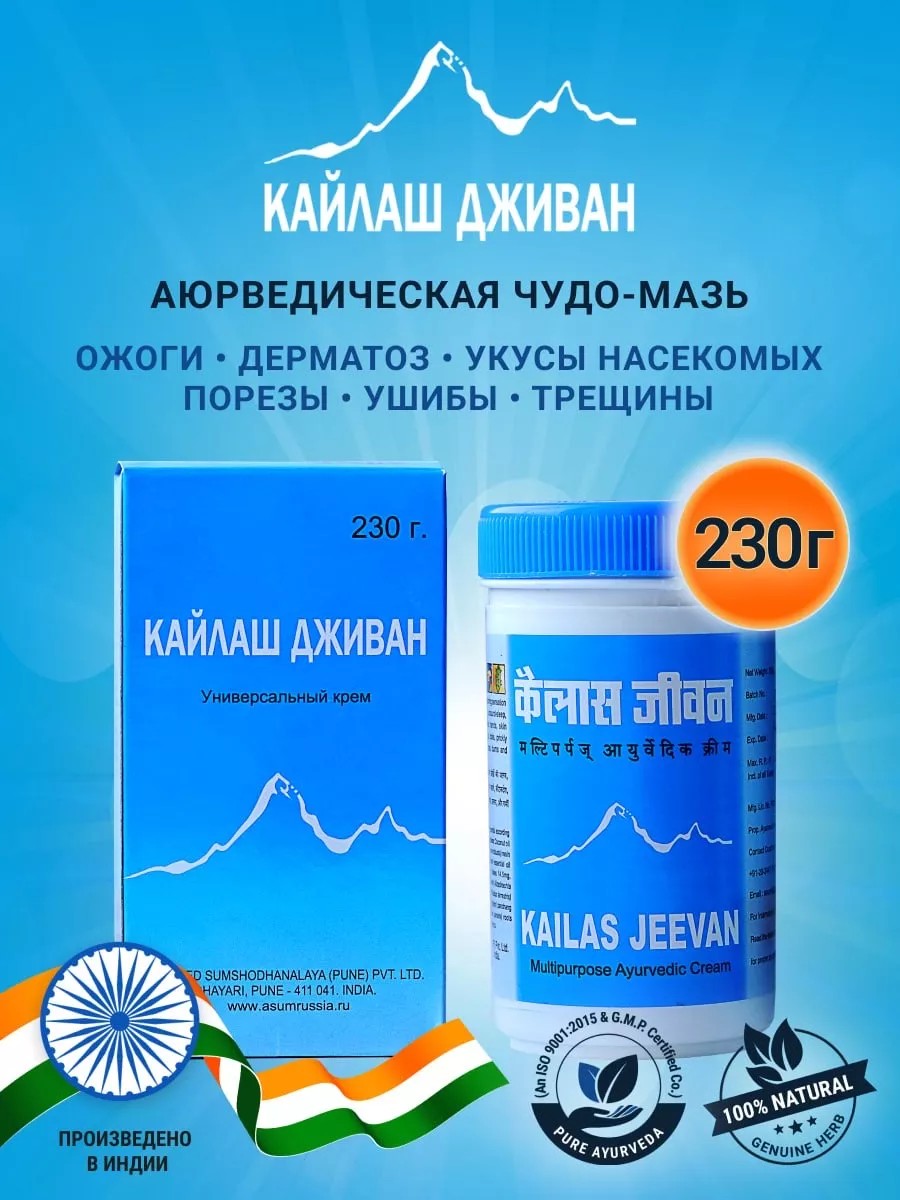 Kailas Jeevan is a universal Ayurvedic cream with a broad spectrum of benefits. Please note that liquid separation from the other components of the cream is normal, as this product is 100% natural! You can be sure of the cream's quality if you notice liquid on the surface when opening the jar—this is normal. At low temperatures, the ointment hardens and liquid is released (as the ointment is coconut oil-based, the oil displaces water when it hardens). We recommend warming the ointment in a double boiler and mixing until smooth before use. It helps relieve skin ailments and heal wounds and cuts. It is suitable for tattoo treatment and skin care after lariat procedures. Thanks to Kailash Jeevan, bruises heal faster. This lifesaving remedy is effective for sunburn and after-sun cream. Used as a sunscreen with SPF 35, the balm helps relieve itching from insect bites. It also relieves headaches, migraines, and earaches, relieving physical tension. Kailash Jeevan (Indian Kailash Jeevan) has a positive effect on the musculoskeletal system, relieving fatigue, tension, and redness in the eyes. This multifunctional cream is effective for cracked heels and dry skin. Suitable for daily use as a facial, nighttime, or daytime cream. The ointment is effective for hemorrhoids and psoriasis. It eliminates dryness and dullness. It combats skin imperfections and wrinkles, and with regular use, preserves youthfulness and adds freshness to the face. For ear infections, place a tampon soaked in the cream in the affected ear. Coughs are treated with compresses on the chest and back. Redness and eye fatigue are treated by applying a thin layer of the cream to the eyelids and under the eyes. Sleep disturbances are relieved by applying Kailas Jeevan ointment to the crown, temples, forehead, and neck. It relieves brain overstimulation due to mental stress. It makes a great gift for any occasion for both men and women. Indian cosmetics.