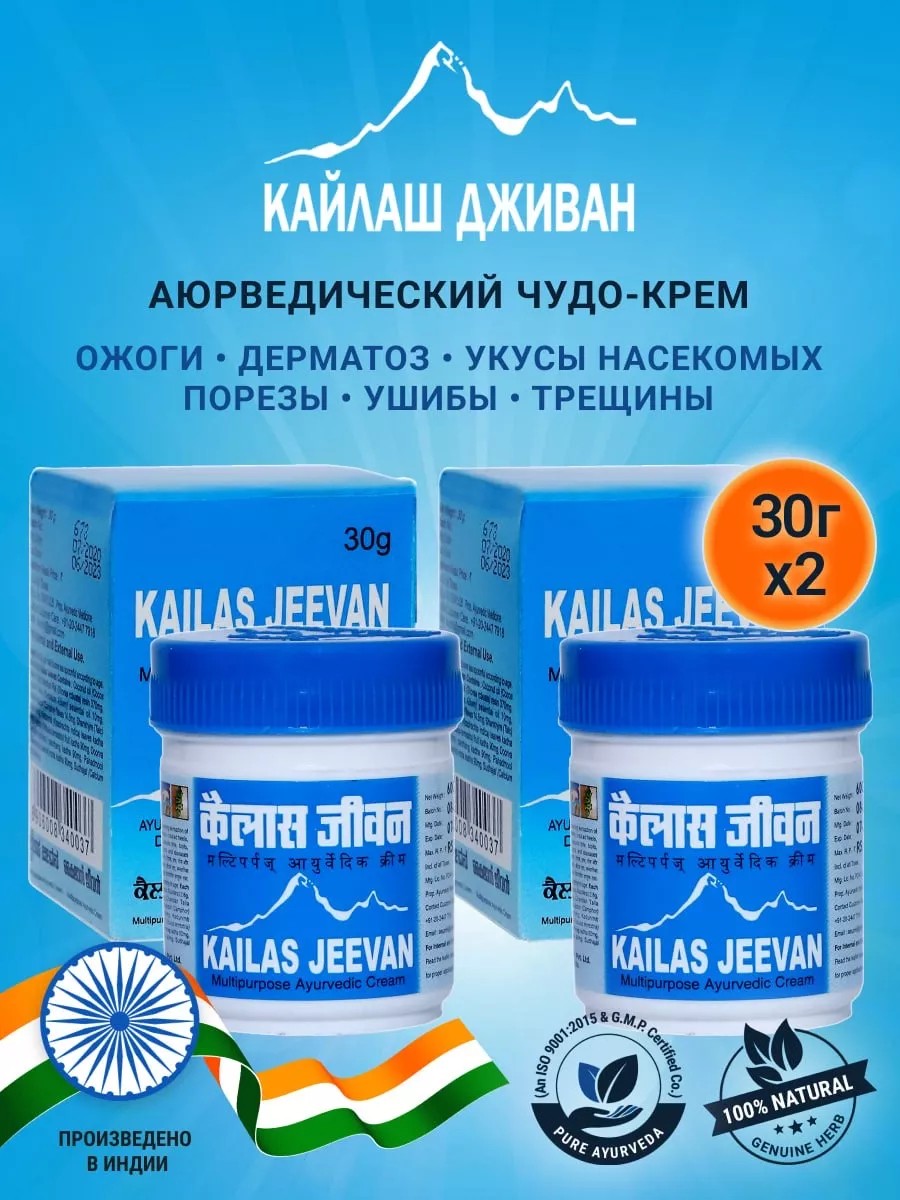 Kailas Jeevan is a universal Ayurvedic cream with a broad spectrum of benefits. Please note that liquid separation from the other components of the cream is normal, as this product is 100% natural! You can be sure of the cream's quality if you notice liquid on the surface when opening the jar—this is normal. At low temperatures, the ointment hardens and liquid is released (as the ointment is coconut oil-based, the oil displaces water when it hardens). We recommend warming the ointment in a double boiler and mixing until smooth before use. It helps relieve skin ailments and heal wounds and cuts. It is suitable for tattoo treatment and skin care after lariat procedures. Thanks to Kailash Jeevan, bruises heal faster. This lifesaving remedy is effective for sunburn and after-sun cream. Used as a sunscreen with SPF 35, the balm helps relieve itching from insect bites. It also relieves headaches, migraines, and earaches, relieving physical tension. Kailash Jeevan (Indian Kailash Jeevan) has a positive effect on the musculoskeletal system, relieving fatigue, tension, and redness in the eyes. This multifunctional cream is effective for cracked heels and dry skin. Suitable for daily use as a facial, nighttime, or daytime cream. The ointment is effective for hemorrhoids and psoriasis. It eliminates dryness and dullness. It combats skin imperfections and wrinkles, and with regular use, preserves youthfulness and adds freshness to the face. For ear infections, place a tampon soaked in the cream in the affected ear. Coughs are treated with compresses on the chest and back. Redness and eye fatigue are treated by applying a thin layer of the cream to the eyelids and under the eyes. Sleep disturbances are relieved by applying Kailas Jeevan ointment to the crown, temples, forehead, and neck. It relieves brain overstimulation due to mental stress. It makes a great gift for any occasion for both men and women. Indian cosmetics.