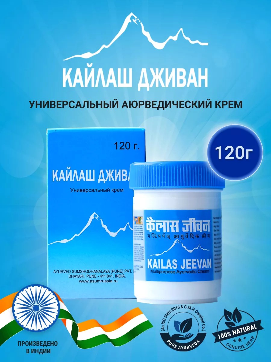 Свежая поставка! Kailas Jeevan - универсальный аюрведический крем широкого спектра действий. Обращаем ваше внимание, что допустимо отделение жидкости от других компонентов крема, так как это средство на 100% натуральное! Можете не сомневаться в качестве крема, если при вскрытии баночки заметили на поверхности жидкость - это норма. При низкой температуре мазь твердеет и выделяется жидкость (т.к. в мазь на основе кокосового масла, при затвердевании, масло вытесняет воду). Рекомендуем перед использованием мазь нагреть на водяной бане и перемешать до однородной консистенции. Способствует избавлению от кожных недугов и заживлению ран, порезов. Подходит для обработки татуировок, уход за кожей после лазерных процедур. Благодаря Кайлаш Дживан быстрее заживают синяки. Это средство - спасатель эффективно действует при солнечных ожогах , крем после загара. Используется в качестве крема для защиты от солнечных лучей - spf 35. Бальзам помогает снять зуд от укусов насекомых. Спасает от головной боли и мигрени, боли в ушах, устраняет физическое напряжение. Кайлаш Дживан индийский оказывает положительное воздействие на опорно-двигательную систему. Снимает усталость, напряжение и покраснение глаз. Многофункциональный крем эффективен при трещинах на пятках и сухости кожи. Подходит для ежедневного использования в качестве уходового крема для лица, ночного или дневного. Устраняет сухоть и станутость. Борется с несовершенствами кожи, морщинами, при регулярном использовании сохраняет молодость и придает свежесть лицу. При отитах поместить в больную ушную раковину тампон, смазанный кремом. Кашель лечат компрессами на грудную клетку и спину. Покраснение и усталость глаз лечится нанесением крема тонким слоем на веки и под глаза. Нарушения сна устраняются при нанесении на темечко, зону висков, лоб и шею мази. Избавляет от перевозбуждения головного мозга вследствие умственной нагрузки. Станет прекрасным подарком на любой праздник как мужчине так и женщине. Оздоровительная индийская косметика.