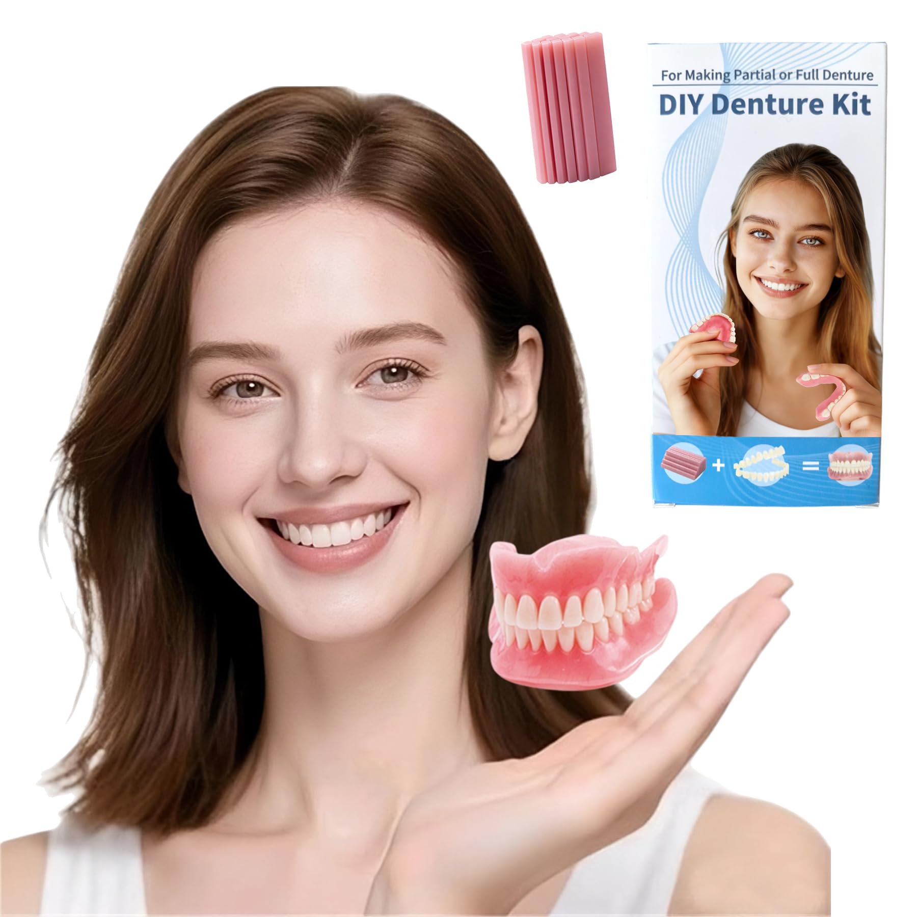 How To Use Please kindly refer to the user instruction. Below is for your brief reference STEP 1: Choose the Right Shape and Size of Temporary Teeth Fake teeth in the packaging comes in a diversed range of shapes and sizes. Picking the most suitable ones is pivotal for restoring your beautiful smile. Consider factors such as how it aligns with your existing teeth in terms of shape, size, and overall appearance. STEP 2: Extract the Ideal Fake Teeth from the Denture Kit Utilize scissors or tweezers to gently remove the fake tooth you have chosen from the denture kit. Then try to place the denture in the area of the missing tooth. Assess the fit by checking for any gaps, unevenness, or discomfort. If the denture doesn't fit snugly, you have two options. You can either carefully trim the edges of the denture using appropriate tools to achieve a better fit or select another fake tooth from the kit. STEP 3: Securely Bond the Fake Tooth and Gum Materials When it comes to fabricating the denture, start by soaking the gum materials in hot water for approximately 60 seconds. This will soften the materials, making them malleable. Once softened, take care to evenly apply the gum materials to the back of the fake tooth. Make sure to cover the entire surface that will come into contact with the gum area. Immediately after application, insert the tooth, with the gum materials attached, into the missing tooth area. STEP 4: Ensure the Fake Tooth is Firmly Fixed After inserting the fake tooth into the missing tooth area, patiently wait for the gum materials to cool down completely. This cooling process is essential as it allows the materials to harden and secure the tooth in place. Once cooled, thoroughly verify that the denture fits properly. Check for any signs of looseness, excessive pressure points, or misalignment. If you experience any discomfort or if the fit is not satisfactory, you can reheat the gum materials. You can do this by soaking them in hot water again until they become soft. Then, re - apply the materials to the back of the fake tooth and re - insert the denture, adjusting it to achieve the best possible fit for you.Customizable and Reusable:Kaimloyou Denture Kit provides the necessory materials to create personalized dentures, suitable for those who got missing teeth. The fitting and moldable components supports a medium to large mouth as the size can be adjustable, allowing you to redo the DIY denture until you get a desired fit. Nice Choice for Confidenct Smile Enhancement:Kaimloyou denture kit is an outstanding prouct for friends and family as it offers a practical and convenient solution for those requiring a full or partial denture. Regain natural smile and self - assurance. Safe and Comfortable Materials:Kaimloyou denture kit is crafted from safe, skin - compatible resin materials that provides a snug and comfortable fit without posing any harm to your oral cavity. The seamless design and combined with painstaking attention to every detail which results in a complete and lifelike teeth model. Enhances your appearance and maximizes your comfort throughout the day. Long Lasting Solution:A great tool for individuals grappling with oral cavity concerns, Kaimloyou denture kit is constructed to endure. Offering a stable color, resisting whitening and deformation over time. Besides advanced formula is incorporated to prevent microcracks, ensuring long - lasting performance. The DIY denture serves as a reliable, temporary teeth replacement option which enables you to smile with natural charm and unwavering confidence. Instant and Beautiful Smile Restoration:Designed and manufactured by Kailoyou we offer you a try for creating your own dentures at home swiftly with our user-friendly denture kit. Made from high-quality resin materials, this kit allows you to customize and polish your dentures to achieve the perfect smile effortlessly at home.