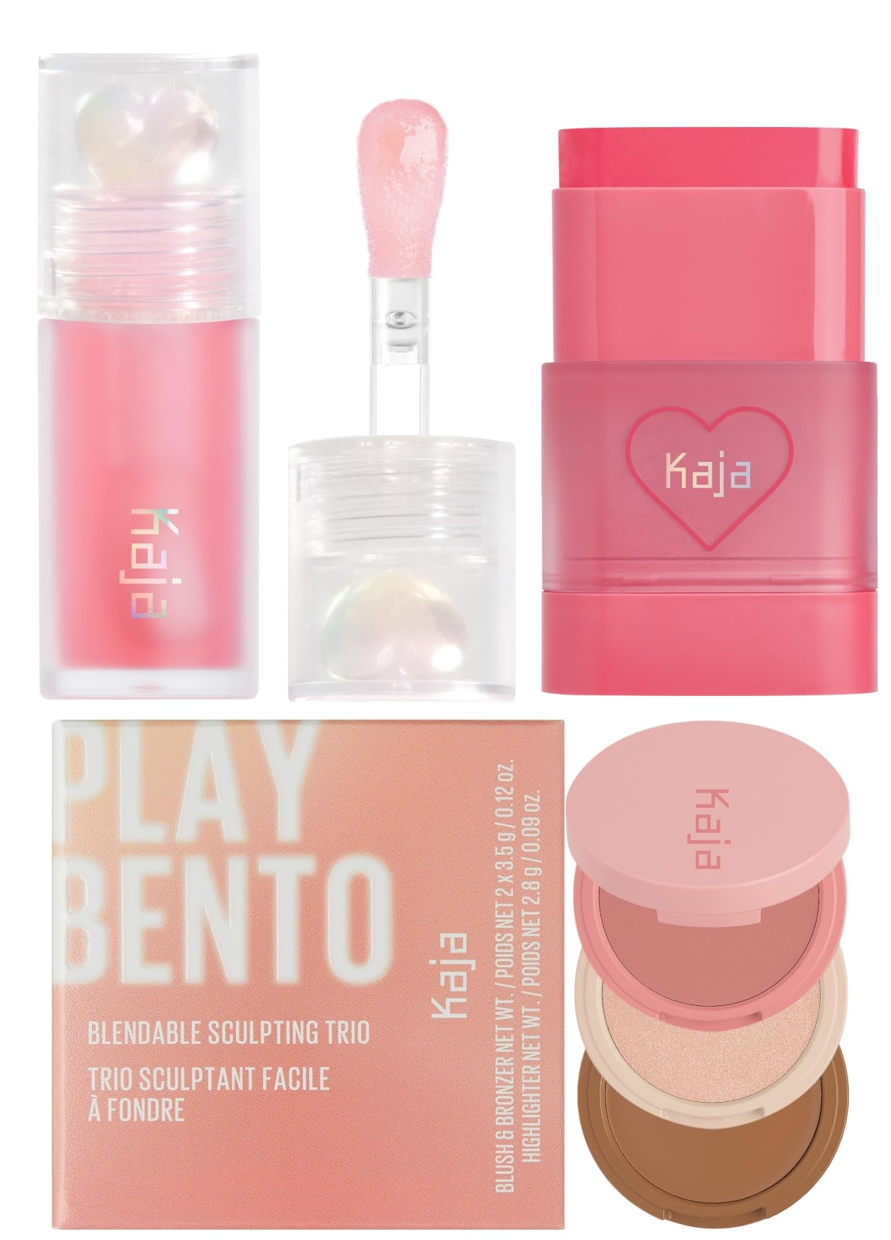 Kaja Juicy Glass Lip Oil 01 Rose Hip Spritz + Dewy Bar - Creamy Multi-Stick Blusher & Lip Balm 02 Strawberry Sorbet 10g + 3-in-1 Blendable Sculpting Trio - Play Bento 01 Butter Up Bundle
