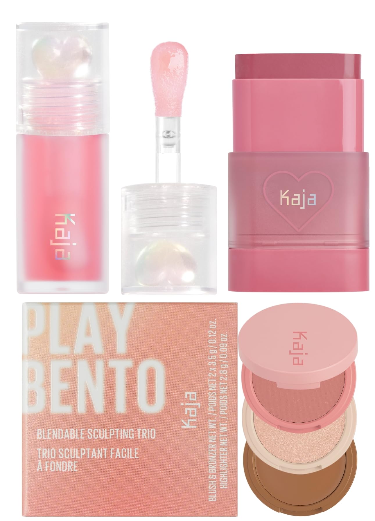 Kaja Juicy Glass Lip Oil 01 Rose Hip Spritz + Dewy Bar - Creamy Multi-Stick Blusher & Lip Balm 04 Fig Smoothie Sorbet 10g + 3-in-1 Blendable Sculpting Trio - Play Bento 01 Butter Up Bundle