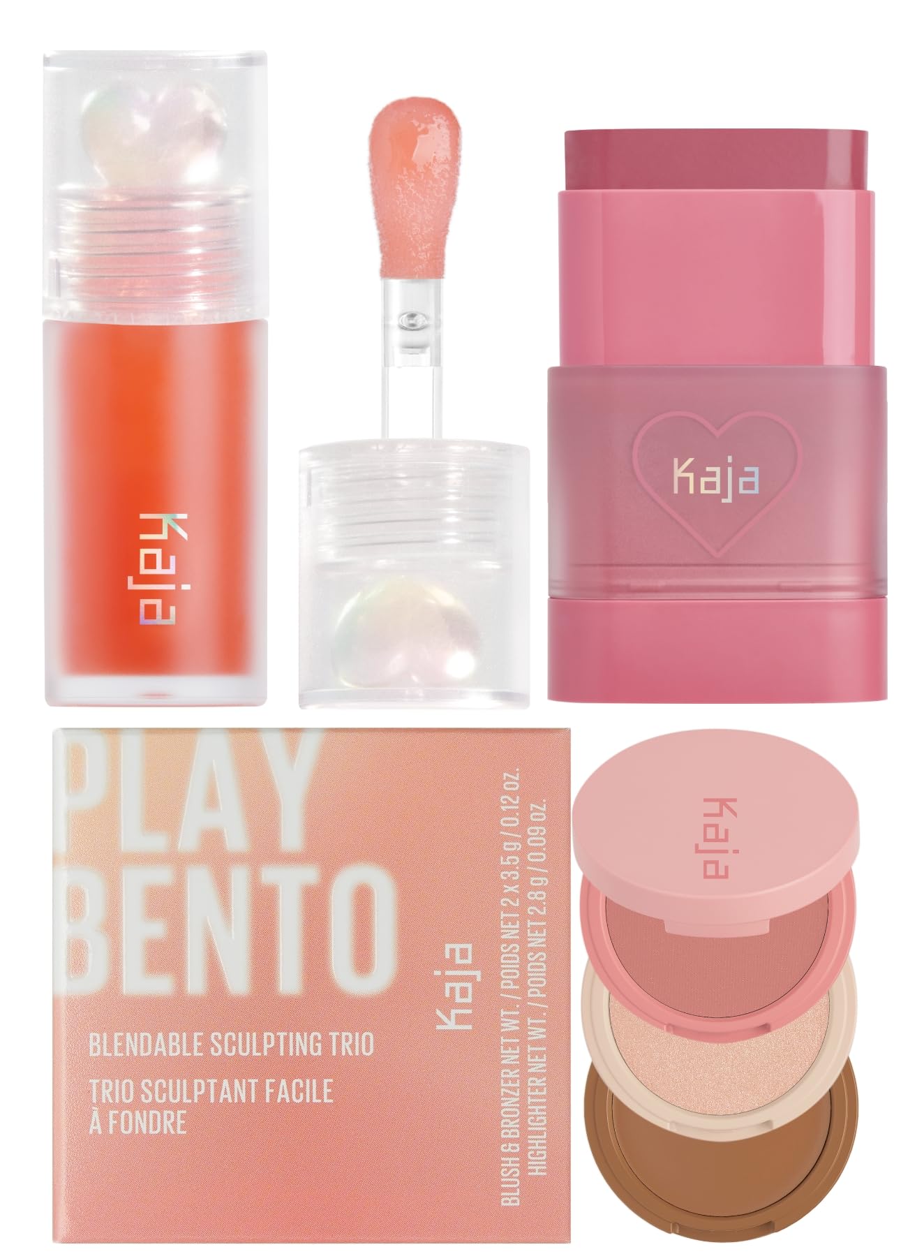 Kaja Juicy Glass Lip Plumping Oil 03 Apricot Allure + Dewy Bar - Creamy Multi-Stick Blusher & Lip Balm 04 Fig Smoothie Sorbet 10g + 3-in-1 Blendable Sculpting Trio - Play Bento 01 Butter Up Bundle