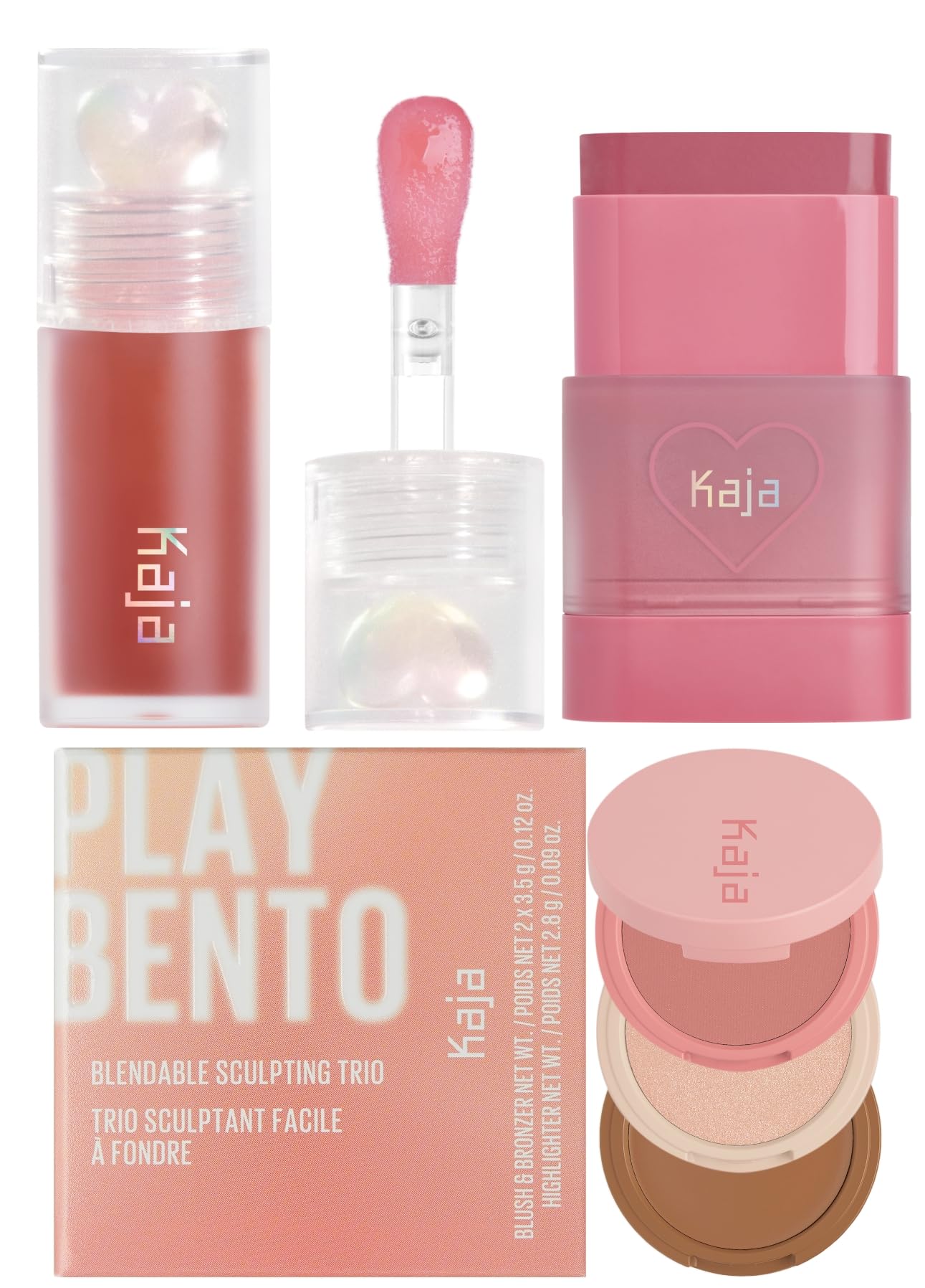 Kaja Juicy Glass Lip Plumping Oil 05 Plum Paloma + Dewy Bar - Creamy Multi-Stick Blusher & Lip Balm 04 Fig Smoothie Sorbet 10g + 3-in-1 Blendable Sculpting Trio - Play Bento 01 Butter Up Bundle