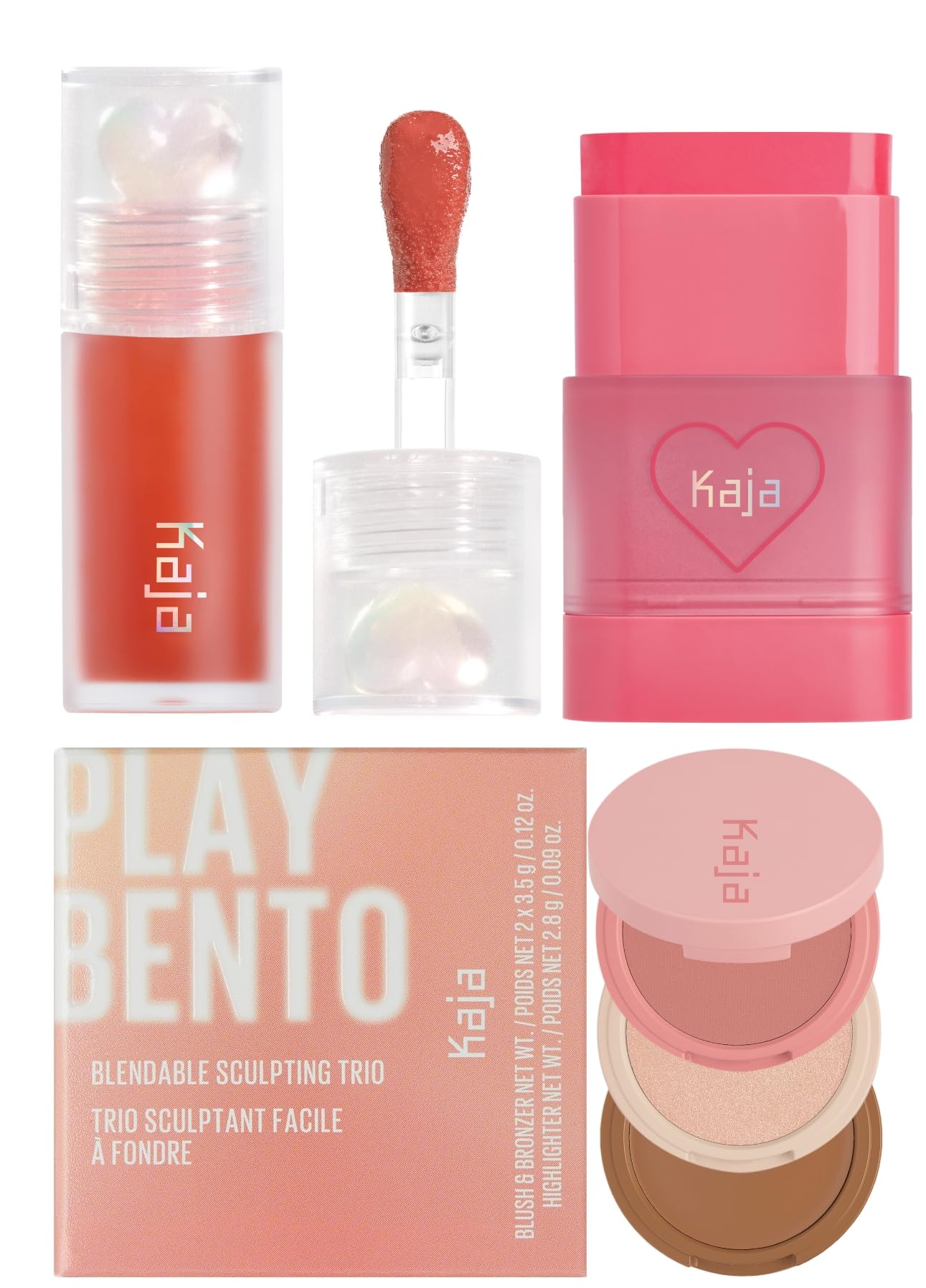 Kaja Juicy Glass Lip Plumping Oil 06 Apple Cider + Dewy Bar - Creamy Multi-Stick Blusher & Lip Balm 02 Strawberry Sorbet 10g + 3-in-1 Blendable Sculpting Trio - Play Bento 01 Butter Up Bundle