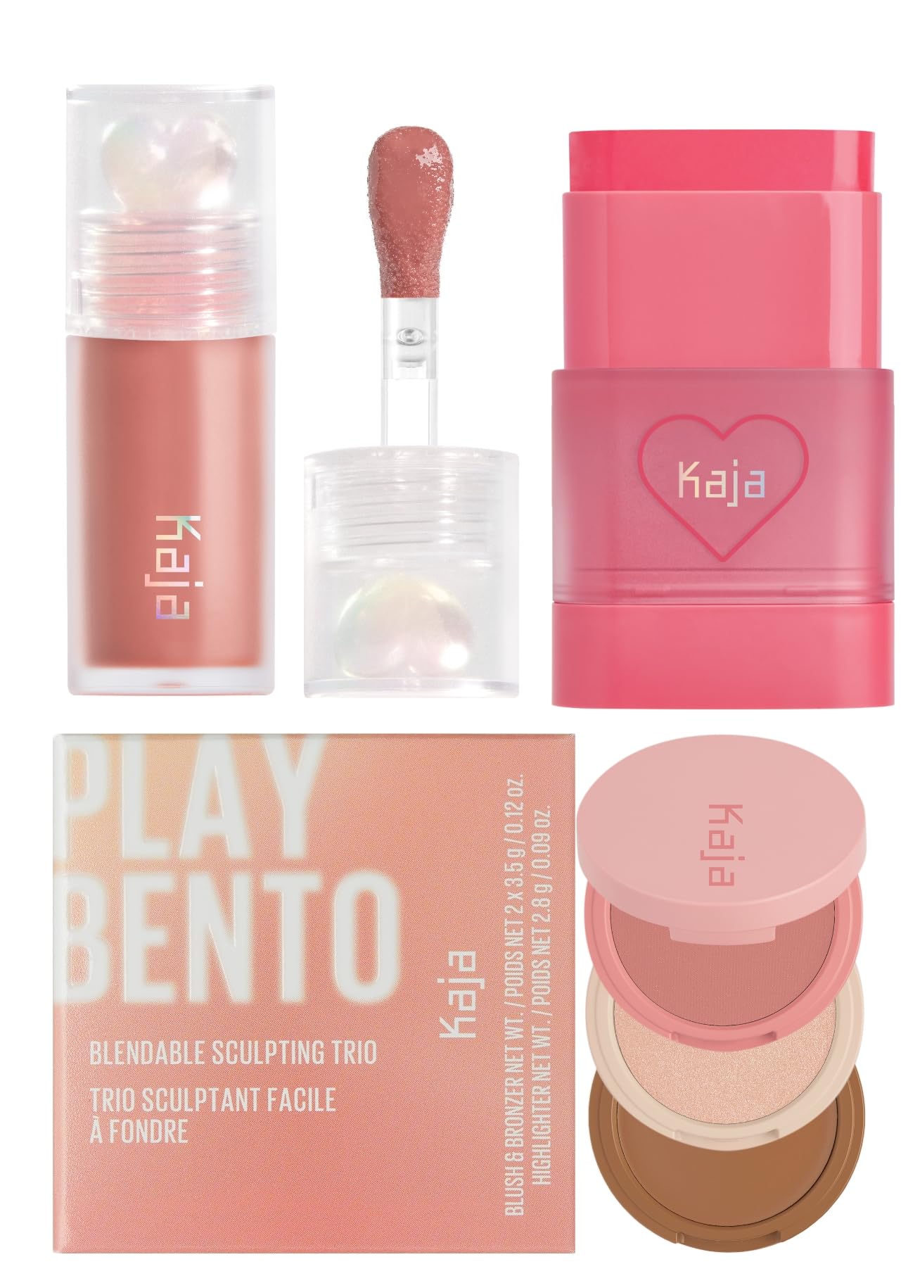 Kaja Juicy Glass Lip Plumping Oil 07 Fig Smoothie + Dewy Bar - Creamy Multi-Stick Blusher & Lip Balm 02 Strawberry Sorbet 10g + 3-in-1 Blendable Sculpting Trio - Play Bento 01 Butter Up Bundle