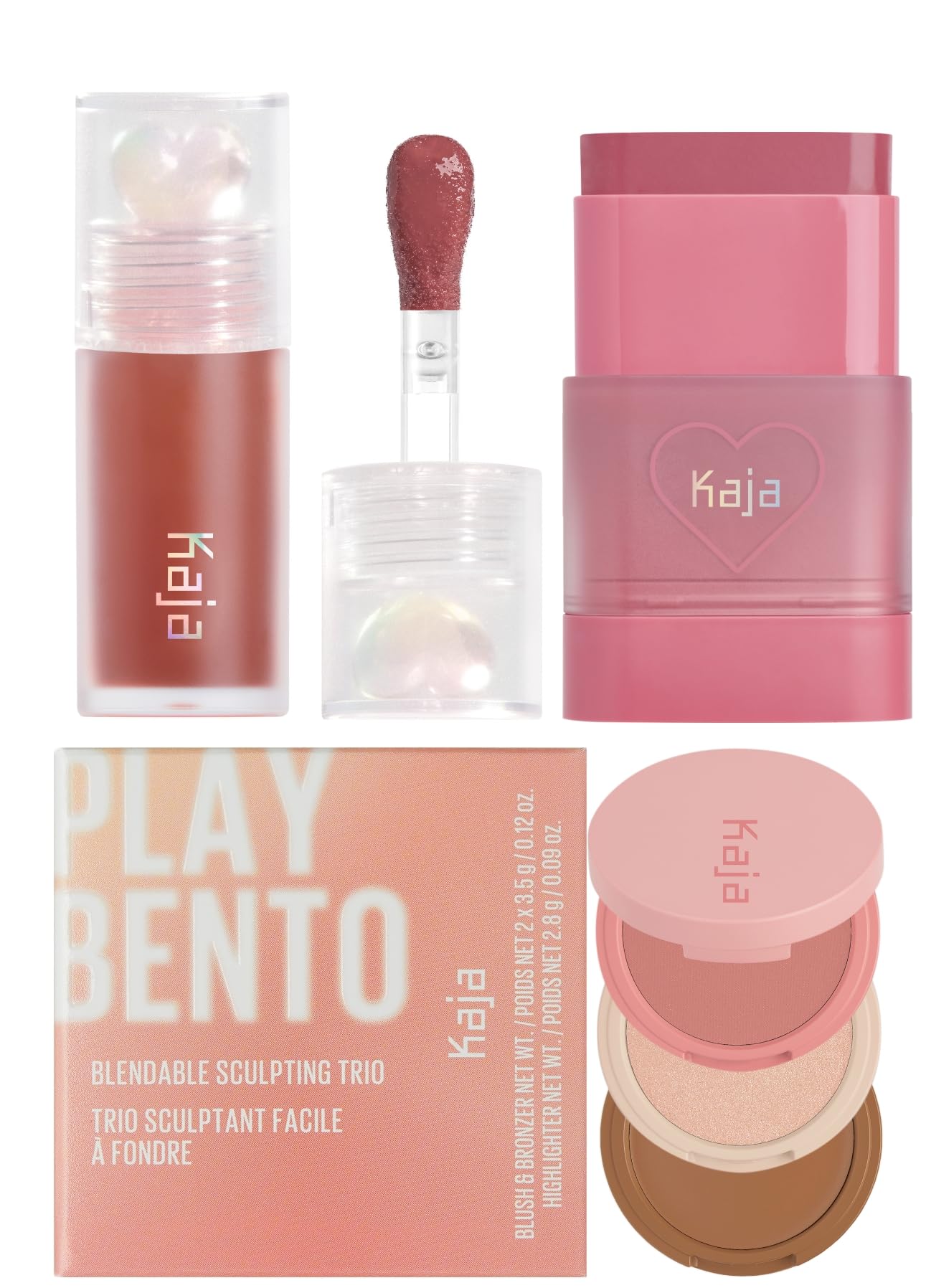 Kaja Juicy Glass Lip Plumping Oil 08 Cherry Cola + Dewy Bar - Creamy Multi-Stick Blusher & Lip Balm 04 Fig Smoothie Sorbet 10g + 3-in-1 Blendable Sculpting Trio - Play Bento 01 Butter Up Bundle