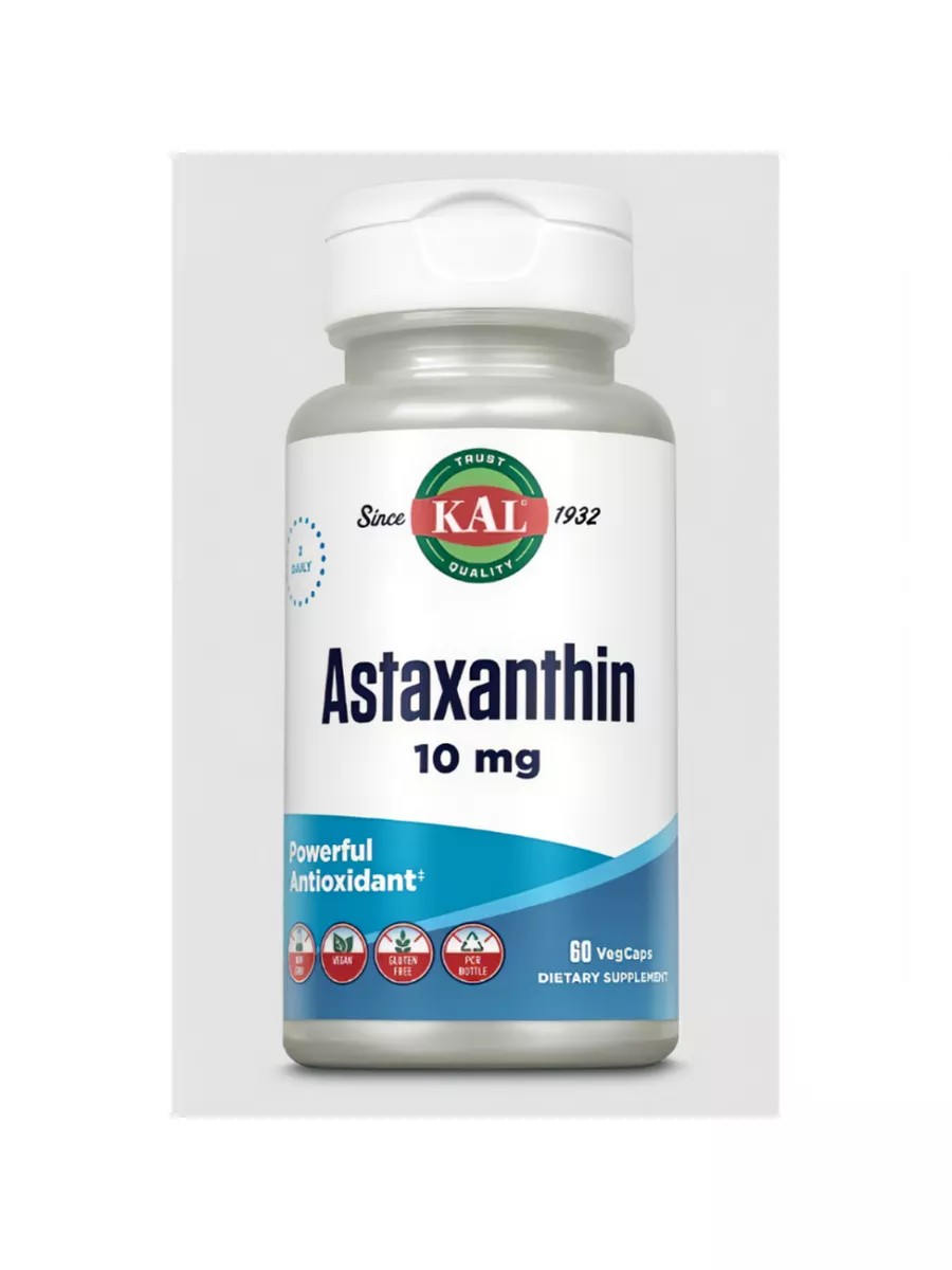 Kal Astaxanthin 10 mg is a powerful dietary supplement containing 10 mg of astaxanthin per capsule, a natural antioxidant known for its protective properties. Benefits: Powerful antioxidant protection: Astaxanthin is 6,000 times stronger than vitamin C and 100 times stronger than beta-carotene, protecting cells from damage caused by free radicals. Skin health: Astaxanthin fights photoaging, protects the skin from the harmful effects of UV rays, reduces inflammation and improves its appearance. Immune system support: Strengthens the immune system, increasing the body's resistance to various infections. Improved vision: Astaxanthin helps protect the eyes from age-related macular degeneration, improves visual function and reduces the feeling of eye fatigue. Cardiovascular support: Helps reduce bad cholesterol levels, improves blood circulation and protects the cardiovascular system. Directions: Take 1 capsule daily with food. Ingredients: Each capsule contains: Astaxanthin (from Haematococcus pluvialis) - 10 mg. Recommendations: Consult a healthcare professional before use, especially if you are pregnant, breastfeeding, have a chronic illness, or are taking other medications. Do not exceed the recommended dosage. Store in a cool, dry place out of the reach of children. Kal Astaxanthin 10 mg is a natural antioxidant that helps protect the body from negative environmental influences, maintain healthy skin, vision, the immune system, and the entire body as a whole.