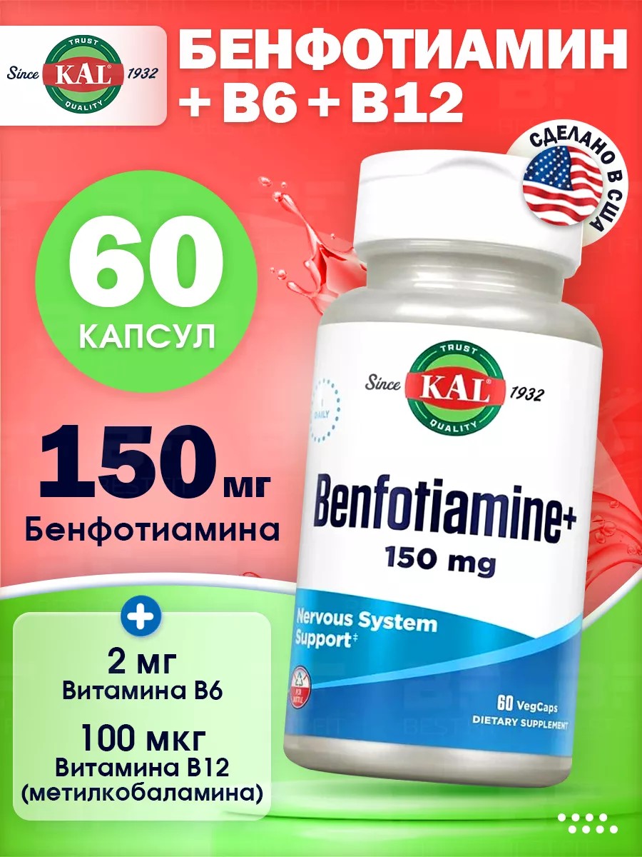 Benfotiamine+, 150 mg, 60 capsules from KAL, Benfotiamine+ 60 VegCaps 150 mg. BENEFITS: Benfotiamine+ 150 mg is a high-quality product designed specifically to support the overall health of various body systems and normalize metabolism. Its main component is benfotiamine, which has unique properties. KAL Benfotiamine+ contains 150 mg of benfotiamine, ensuring an optimal dosage for maximum results. Benfotiamine is a form of vitamin B1 that is easily absorbed by the body and has high bioavailability. One of the main benefits of benfotiamine is its ability to prevent fat accumulation, which is especially important for those striving to maintain a healthy lifestyle and manage their weight. This product also has a positive effect on the health of the nervous system, intestines, skin, hair, nails, and liver, and helps normalize blood composition. Benfotiamine+ can also prevent precancerous changes in cells and promote healthy hormone synthesis, as well as normal thyroid function. If you are looking for a natural product that will help you improve your overall health and support the normal functioning of the body, Benfotiamine is the ideal choice for you. Trust its effectiveness and start taking care of your health today! BENEFITS: A healthy nervous system even during times of stress; Beautiful nails, skin, and hair without flaking; Intestinal and liver function; Hormone production, including testosterone; Thyroid function. DIRECTIONS: Take 1 vegetarian capsule daily with a meal or glass of water. INGREDIENTS: Cellulose, vegetable cellulose capsule, magnesium stearate, and silicon dioxide. CONTRAINDICATIONS: Individual intolerance. If you are pregnant, nursing, taking any medications, or have any medical condition, consult a physician before taking any dietary supplement. Not a medicine. WARNINGS: Keep out of reach of children. Do not exceed the recommended dosage. Do not use if outer protective film is damaged. Store tightly closed in a cool, dry place. The manufacturer may change the composition and/or design without notice. This does not affect the quality of the product. We strive to update product information promptly.