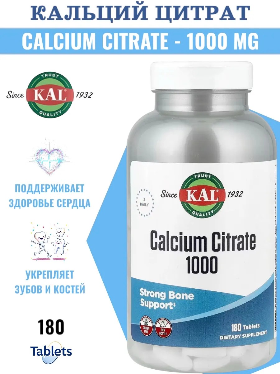 Каждая порция цитрата кальция 1000 от KAL обеспечивает поступление кальция высокой эффективности. Кальций обеспечивает питательную поддержку здоровья костей и зубов.
