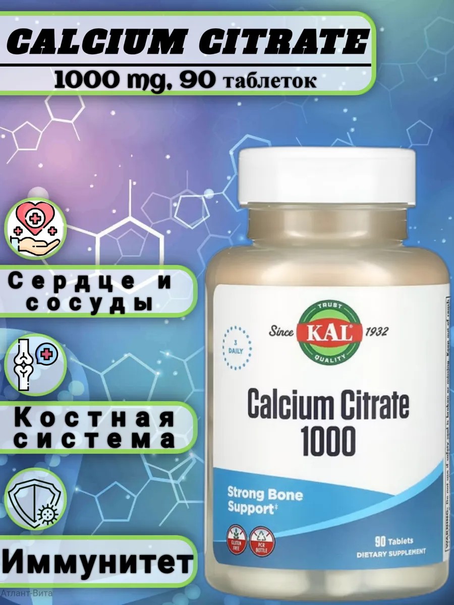 KAL Calcium Citrate, Цитрат кальция 1000мг,90 таблеток