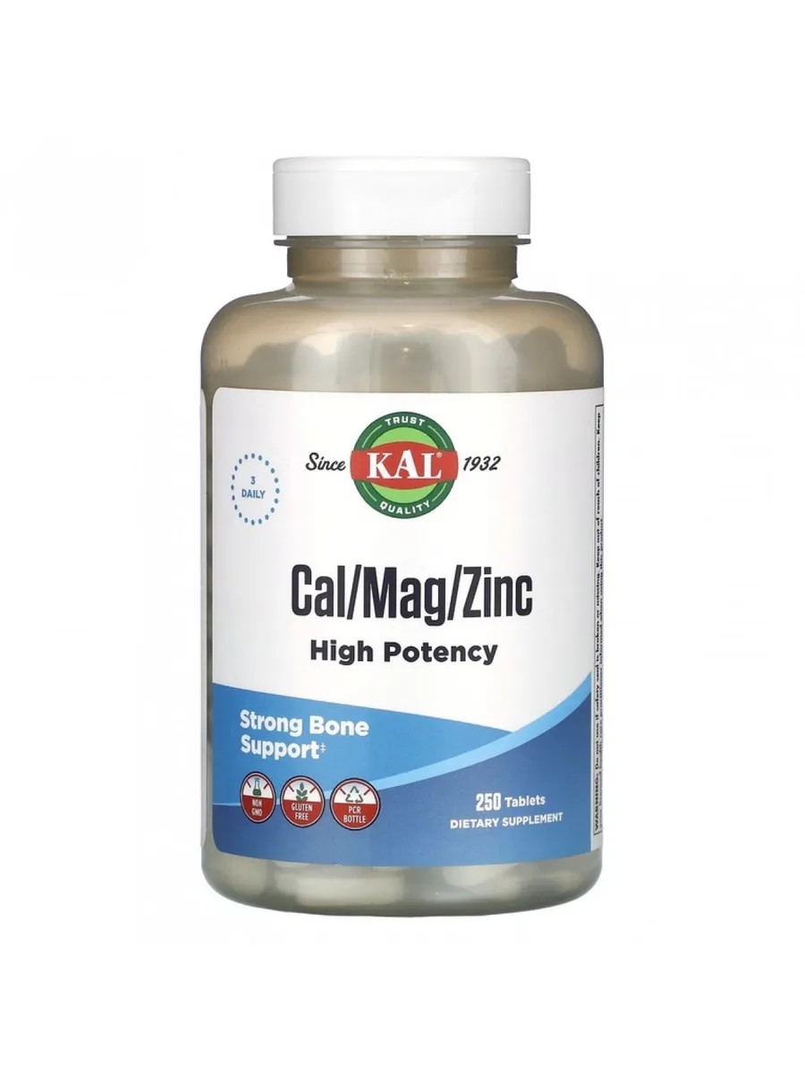 Kal Calcium Magnesium Zinc is a comprehensive dietary supplement containing calcium, magnesium, and zinc, essential for maintaining healthy bones, muscles, and overall well-being. Benefits: Healthy bones: Calcium is a key building block of bone tissue, helping prevent osteoporosis and maintain bone strength. Strong muscles: Magnesium plays a vital role in muscle contraction, preventing cramps and supporting normal muscle function. Improved sleep: Magnesium promotes muscle and nervous system relaxation, promoting healthy sleep. Immune support: Zinc strengthens the immune system, protecting the body from infections and viruses. Strengthening nails and hair: Zinc is essential for the normal growth and development of hair and nails, keeping them strong and healthy. Directions: Take 2 tablets daily with meals. Ingredients: Each tablet contains: Calcium (as calcium carbonate) - 1000 mg Magnesium (as magnesium oxide) - 400 mg Zinc (as zinc glycinate) - 15 mg Recommendations: Consult your doctor before use, especially if you are pregnant, breastfeeding, have a chronic medical condition, or are taking other medications. Do not exceed the recommended dosage. Store in a cool, dry place out of the reach of children.