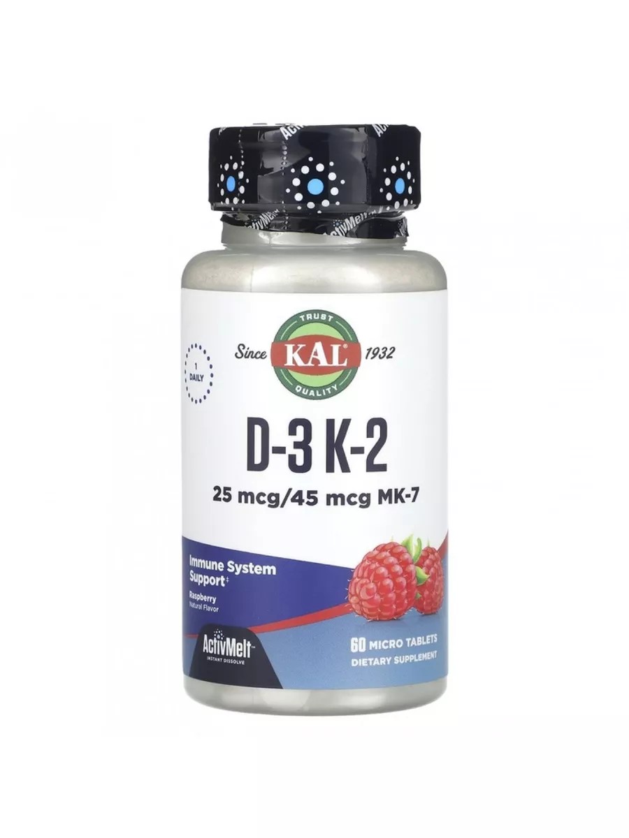 Kal D-3 1000 МЕ K-2 45 мкг ActivMelt - это удобные жевательные таблетки, сочетающие в себе витамин D3 (холекальциферол) и витамин K2 (менахинон-7), необходимые для крепких костей, здорового сердца и общего самочувствия.Преимущества: Укрепляет кости: Витамин D3 способствует усвоению кальция и его направлению в кости, а витамин K2 помогает закрепить кальций в костной ткани, что препятствует остеопорозу и укрепляет костную систему. Поддерживает здоровье сердца: Витамин K2 улучшает эластичность кровеносных сосудов, снижает риск образования тромбов и поддерживает здоровье сердечно-сосудистой системы. Улучшает иммунитет: Витамин D3 укрепляет иммунную систему и повышает сопротивляемость организма к инфекциям. Удобный формат: Жевательные таблетки ActivMelt легко растворяются во рту и обладают приятным вкусом, что делает прием витаминов более комфортным. Высокое качество: Kal - известный производитель высококачественных добавок, которые соответствуют строгим стандартам качества. Состав: Одна таблетка содержит 1000 МЕ витамина D3 (холекальциферол) и 45 мкг витамина K2 (менахинон-7). Рекомендации по применению: Принимайте по 1 таблетке в день или по рекомендации врача. Дополнительная информация: Храните продукт в сухом и прохладном месте. Не превышайте рекомендуемую дозировку. Не является заменой полноценного рациона питания. Перед началом приема проконсультируйтесь с врачом, особенно если вы беременны, кормите грудью или принимаете какие-либо лекарства.