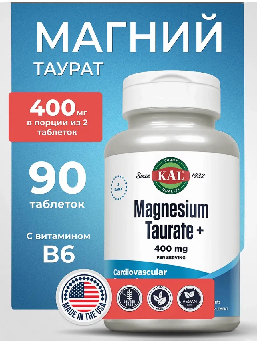 Magnesium Taurate KAL 400 mg is a high-quality supplement from the USA, specially formulated to support the cardiovascular system, reduce stress, and normalize blood pressure.