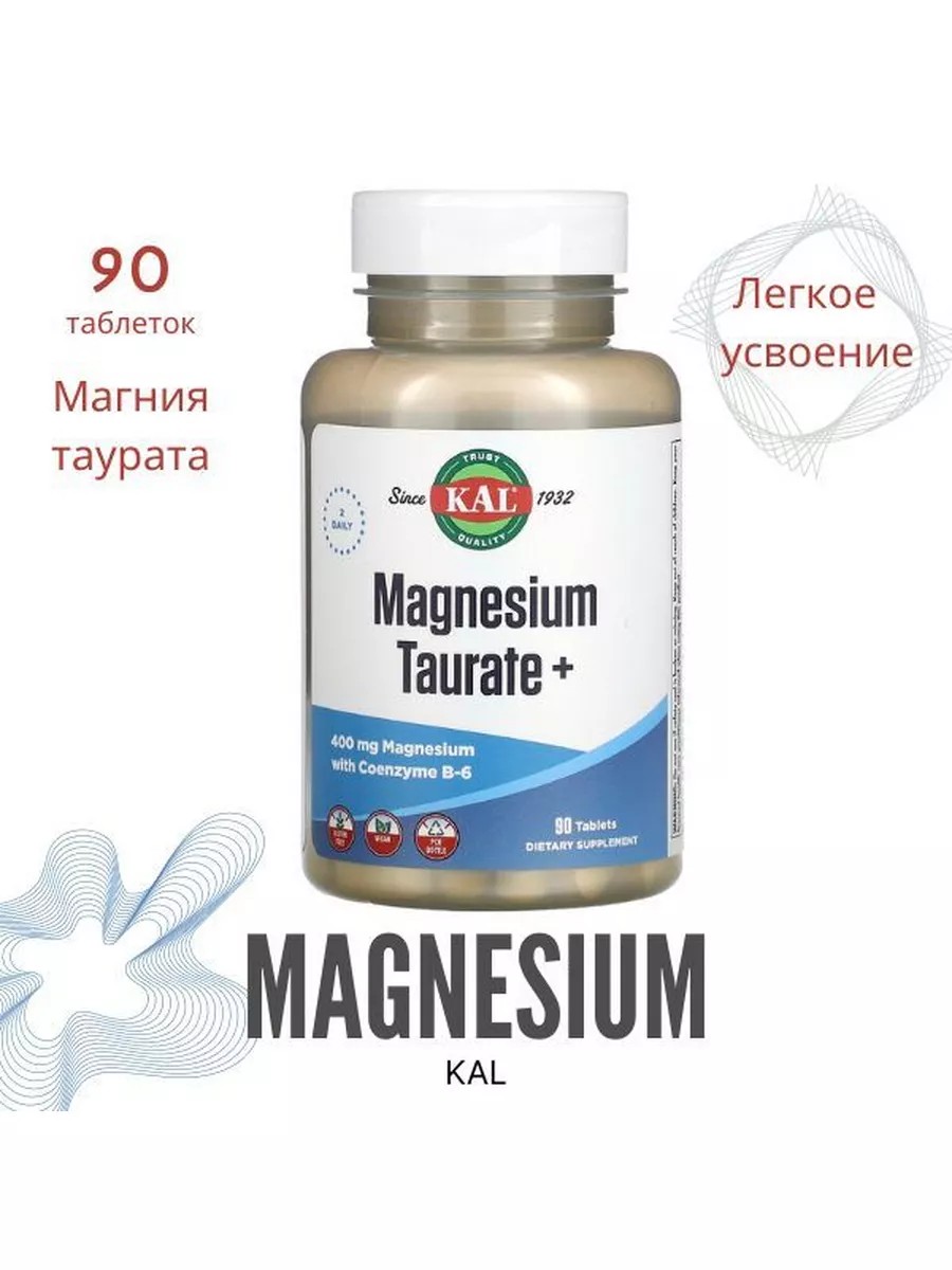 KAL, Magnesium Taurate Plus, 400 mg, 90 Tablets. Contains 400 mg of magnesium with coenzyme B6. KAL Plus Magnesium Taurate is the mineral magnesium combined with the free amino acid taurine. Magnesium taurate provides nutritional support necessary for normal, healthy nervous system and muscle function, as well as for regulating the healthy flow of ions across cell membranes. This ensures membrane stability and protects the heart, blood vessels, and tissues from oxidative stress. Pyridoxal-5-phosphate, the coenzyme form of vitamin B6, provides bioavailable nutritional support necessary for red blood cell synthesis and nerve tissue function. Research has shown a synergistic relationship between magnesium and vitamin B6.