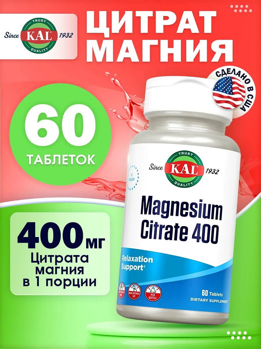 Цитрат магния 60 таблеток KAL, Magnesium Citrate 400, 60 Tablets.