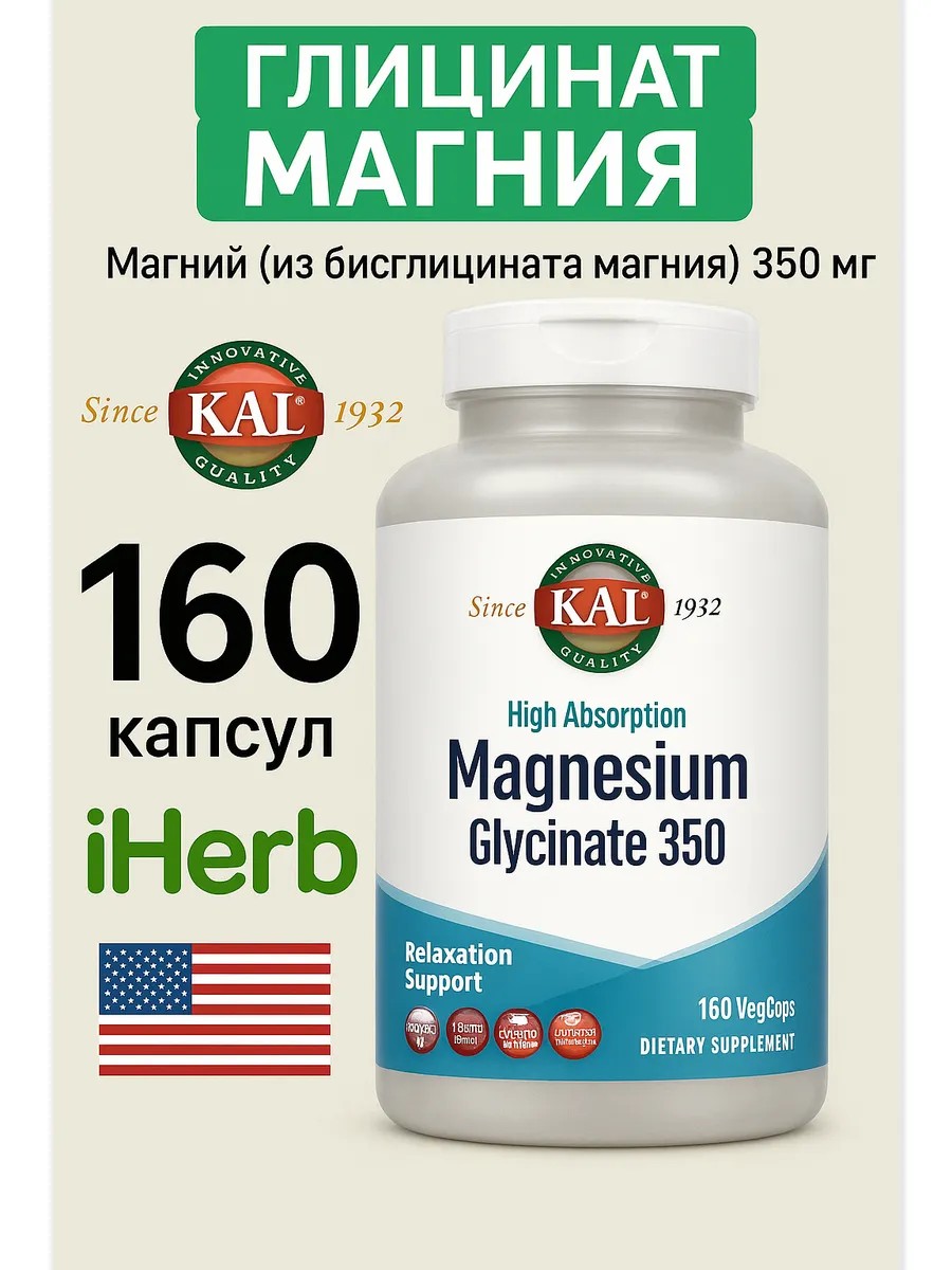 Магний глицинат, магний хелат глицинат магния — наиболее усваиваемая форма магния: обладает высокой биодоступностью и хорошей переносимостью. Магний находится во всех тканях организма, необходим для нормальной работы клеток. Способствует производству и потреблению энергии. Magnesium Glycinate – это рабочая добавка для укрепления здоровья. В ее основе наиболее биодоступная, хелатная, форма магния. Она не только быстро, но и полноценно, метаболизируется в организме. Благодаря этому даже небольших дозировок достаточно, чтобы извлекать максимум пользы из минерала. KAL Magnesium Glycinate 350 — это высококачественная добавка, содержащая магний в форме глицината. Глицинат магния является одной из наиболее усваиваемых форм магния, что позволяет эффективно поддерживать уровень этого важного минерала в организме. Магний играет ключевую роль в более чем 300 биохимических реакциях, включая поддержку нервной системы, нормализацию мышечной функции и поддержку обмена веществ. Магний помогает регулировать уровень стресса и тревожности, способствуя расслаблению и улучшению психоэмоционального состояния, способствует более глубокому и спокойному сну, устраняет бессонницу. Эта добавка также известна своим мягким воздействием на желудок, что делает ее идеальным выбором для тех, кто испытывает дискомфорт при приеме других форм магния. iherb айхерб США кал