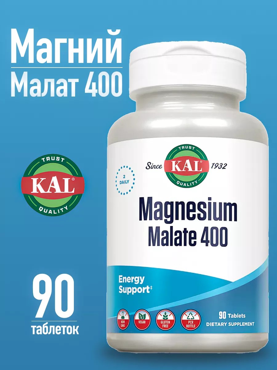 Магний малат kal 400 мг это современная биодоступная форма магния, соединённая с яблочной кислотой (малатом). Такая добавка, известная также как малат магния или магния малат (magnesium malate), объединяет пользу минерала и органической кислоты для комплексного укрепления организма. Для чего принимают магний малат: поддержка работы сердца и сосудов, нормализация сердечного ритма и давления; укрепление нервной системы, снижение тревожности и стрессовых состояний; улучшение качества сна, мягкое успокаивающее действие; повышение жизненного тонуса и энергии, борьба с усталостью; улучшение концентрации и когнитивных функций; универсальная польза для женщин и мужчин, поддержка общего самочувствия. Особенности формы магния малат: высокая усвояемость и лёгкое усвоение организмом; мягкое воздействие на ЖКТ, не вызывающее слабительного эффекта; сочетание минерала с малатом обеспечивает комплексную поддержку сердца, нервной системы и энергетического обмена; оптимальный вариант для регулярного и долгосрочного приёма. Магний малат это надёжное средство для тех, кто заботится о здоровье сердца, нервной системы, энергии, концентрации и общем тонусе организма.