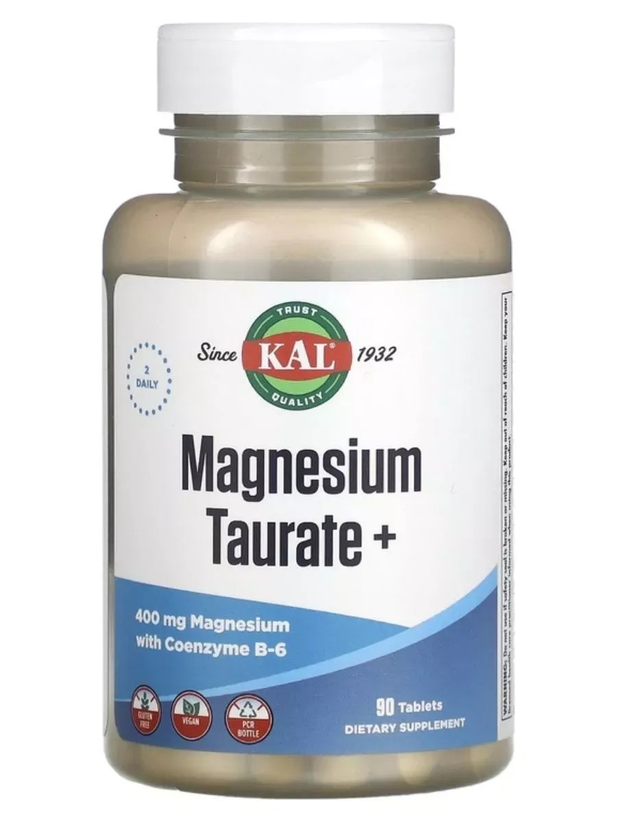 KAL Magnesium Taurate + 400 mg - это минерал магний в сочетании со свободной аминокислотой таурином. Туарат магния оказывает питательную поддержку, необходимую для нормального здорового функционирования нервной системы и мышц, а также для регуляции здорового потока ионов через клеточные мембраны. Это обеспечивает стабильность мембран и защищает от окислительного стресса сердце, кровеносные сосуды и ткани.Пиридоксаль-5-фосфат, коферментная форма витамина В6, беспечивает биодоступную питательную поддержку, необходимую для синтеза эритроцитов и работы нервной ткани. Исследования показали синергетическую взаимосвязь между магнием и витамином В6.- Рекомендации по применению:\*\*Применять только согласно инструкции. Принимать по две (2) таблетки в день во время еды или запивая стаканом воды.- \*\*Ингредиенты: Целлюлоза, стеарат магния, диоксид кремния, стеариновая кислота.Подходит для вегетарианцев и веганов.Магний в6, магний б6 витамины магне б6 KAL / Magnesium Taurate + 400 mg / Магний Таурат с витамином В6/ Здоровье сердца и сосудов/ Снижение стресса. 90 и 180 таблеток