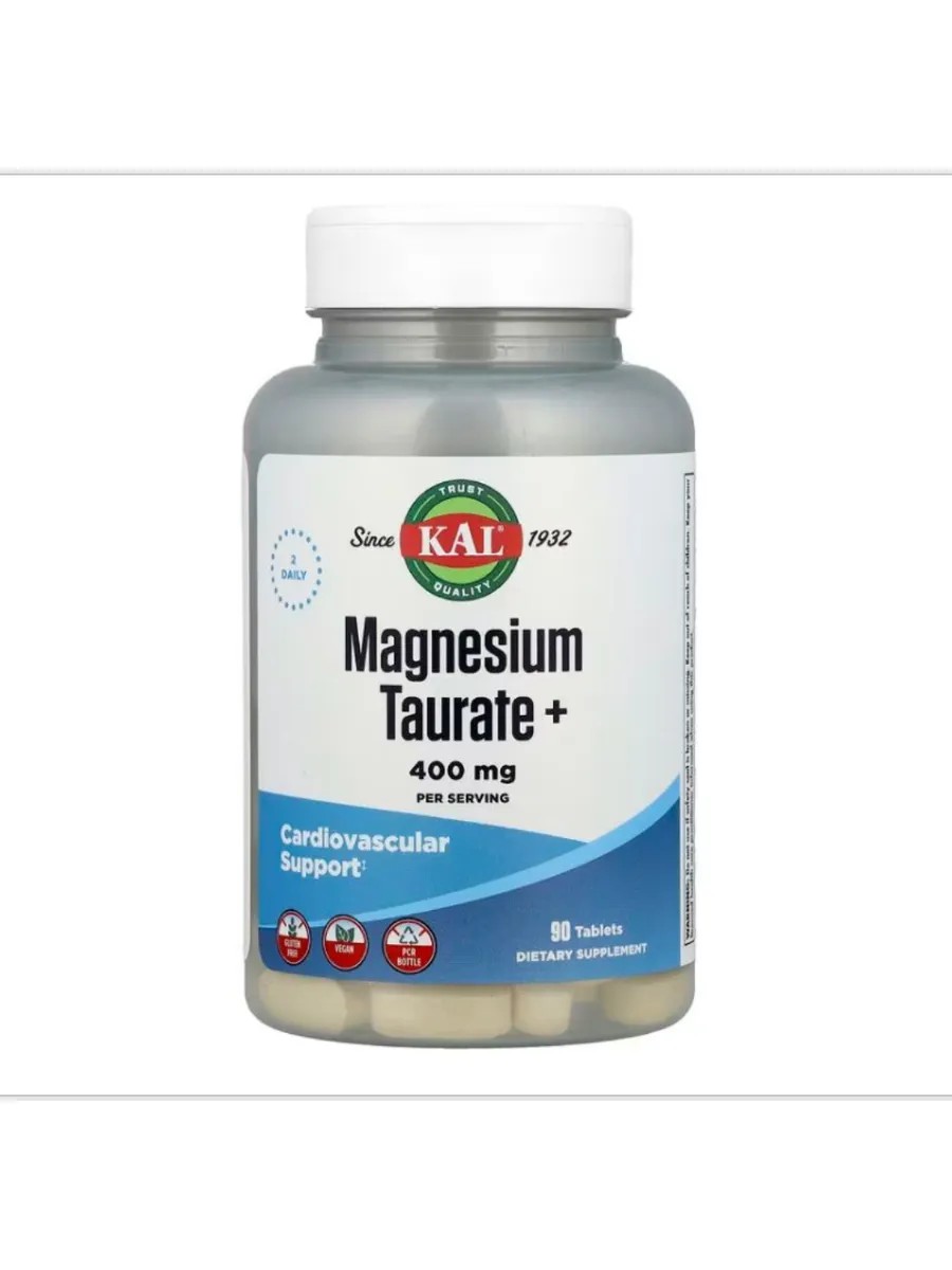 KAL Magnesium Taurate + 400 mg - это минерал магний в сочетании со свободной аминокислотой таурином. Туарат магния оказывает питательную поддержку, необходимую для нормального здорового функционирования нервной системы и мышц, а также для регуляции здорового потока ионов через клеточные мембраны. Это обеспечивает стабильность мембран и защищает от окислительного стресса сердце, кровеносные сосуды и ткани.Пиридоксаль-5-фосфат, коферментная форма витамина В6, обеспечивает биодоступную питательную поддержку, необходимую для синтеза эритроцитов и работы нервной ткани. Исследования показали синергетическую взаимосвязь между магнием и витамином В6. Принимать по две (2) таблетки в день во время еды или запивая стаканом воды. Ингредиенты: целлюлоза, стеарат магния, диоксид кремния, стеариновая кислота. Подходит для вегетарианцев и веганов.