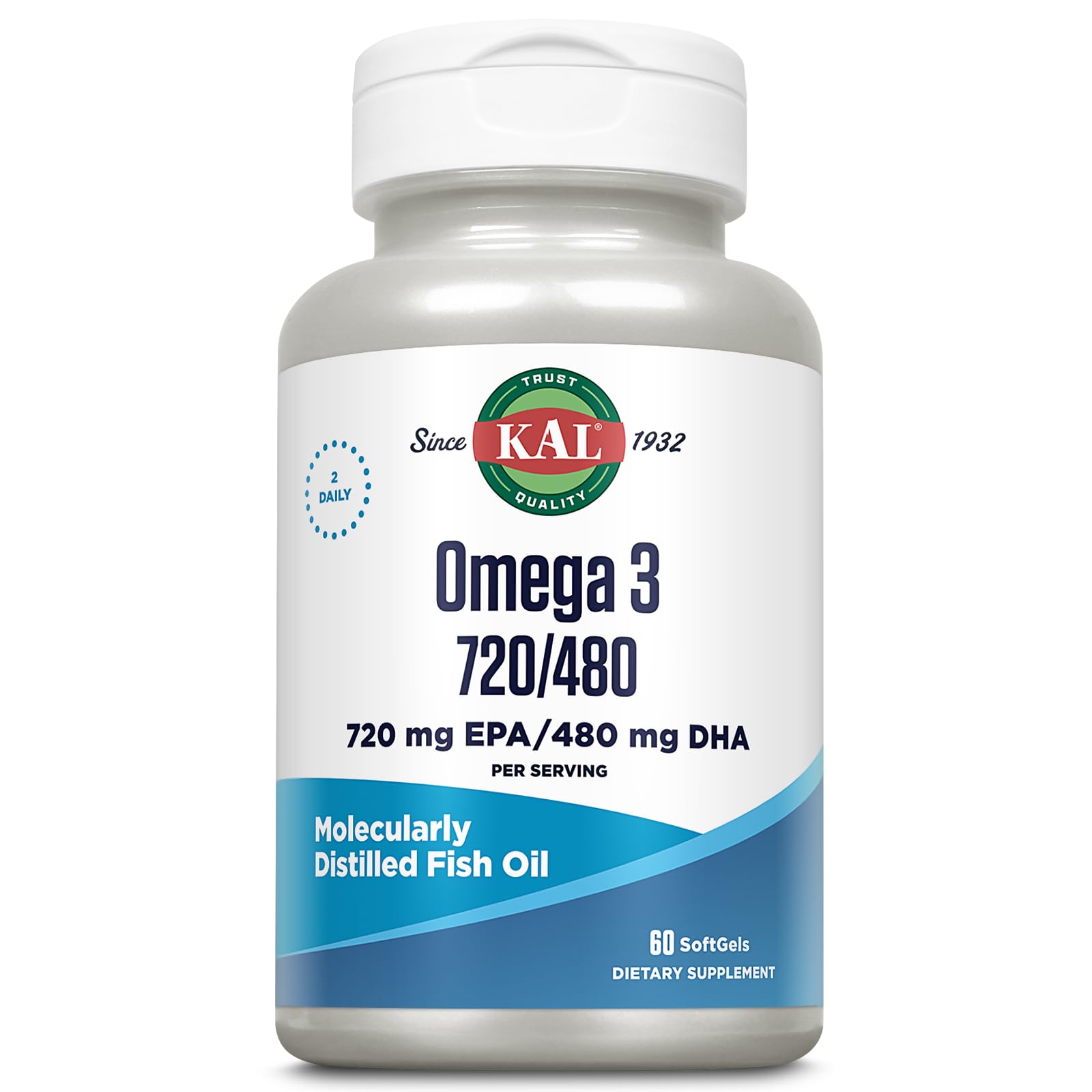 KAL Omega 3 Fish Oil 2 400 mg - 720/480 EPA DHA Supplements - Eye Brain and Joint Support Supplement - Molecularly Distilled and Lab Verified - 60-Day Guarantee - 30 Servings 60 Softgels