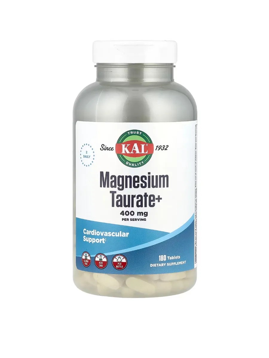 . KAL Plus Magnesium Taurate is the mineral magnesium combined with the free amino acid taurine. Magnesium taurate provides nutritional support necessary for normal, healthy nervous system and muscle function, as well as for regulating the healthy flow of ions across cell membranes. This helps ensure membrane stability and protect the heart, blood vessels, and tissues from oxidative stress. Pyridoxal-5-phosphate, a coenzyme form of vitamin B6, provides bioavailable nutritional support necessary for red blood cell synthesis and nerve tissue function. Take 2 tablets daily with a meal or glass of water. Use only as directed.