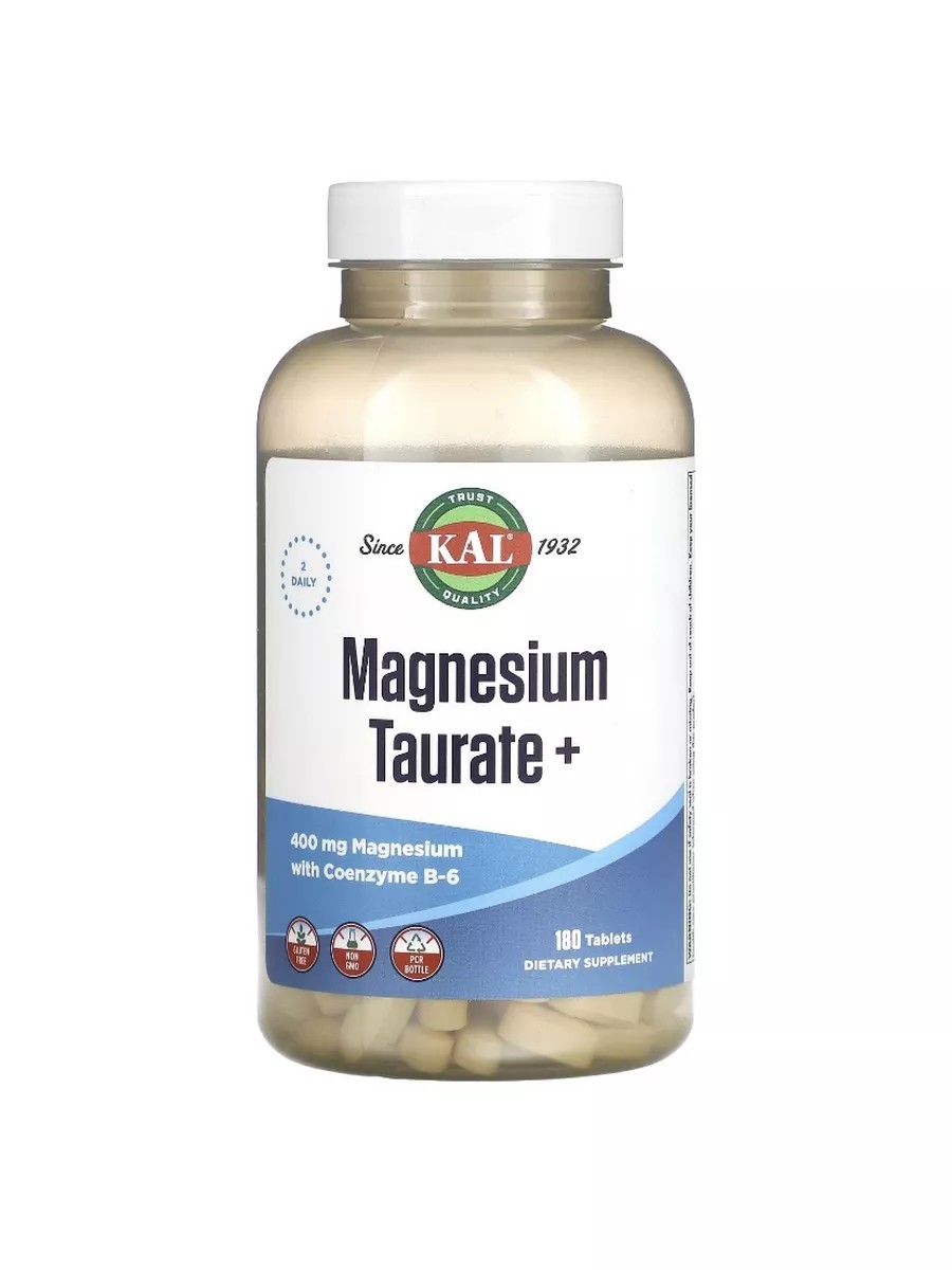 KAL Plus Magnesium Taurate is the mineral magnesium combined with the free amino acid taurine. Magnesium taurate provides nutritional support necessary for normal, healthy nervous system and muscle function, as well as for regulating the healthy flow of ions across cell membranes. This ensures membrane stability and protects the heart, blood vessels, and tissues from oxidative stress. Pyridoxal-5-phosphate, a coenzyme form of vitamin B6, provides bioavailable nutritional support necessary for red blood cell synthesis and nerve tissue function. Research has shown a synergistic relationship between magnesium and vitamin B6. Free from gluten, soy, dairy, and GMOs. Suitable for vegetarians and vegans. Contains 400 mg (2 tablets daily) of magnesium with coenzyme B6. Keep out of reach of children. Consult a physician before use. Store in a cool, dry place. KAL Magnesium Taurate + Magnesium Taurate + 400 mg