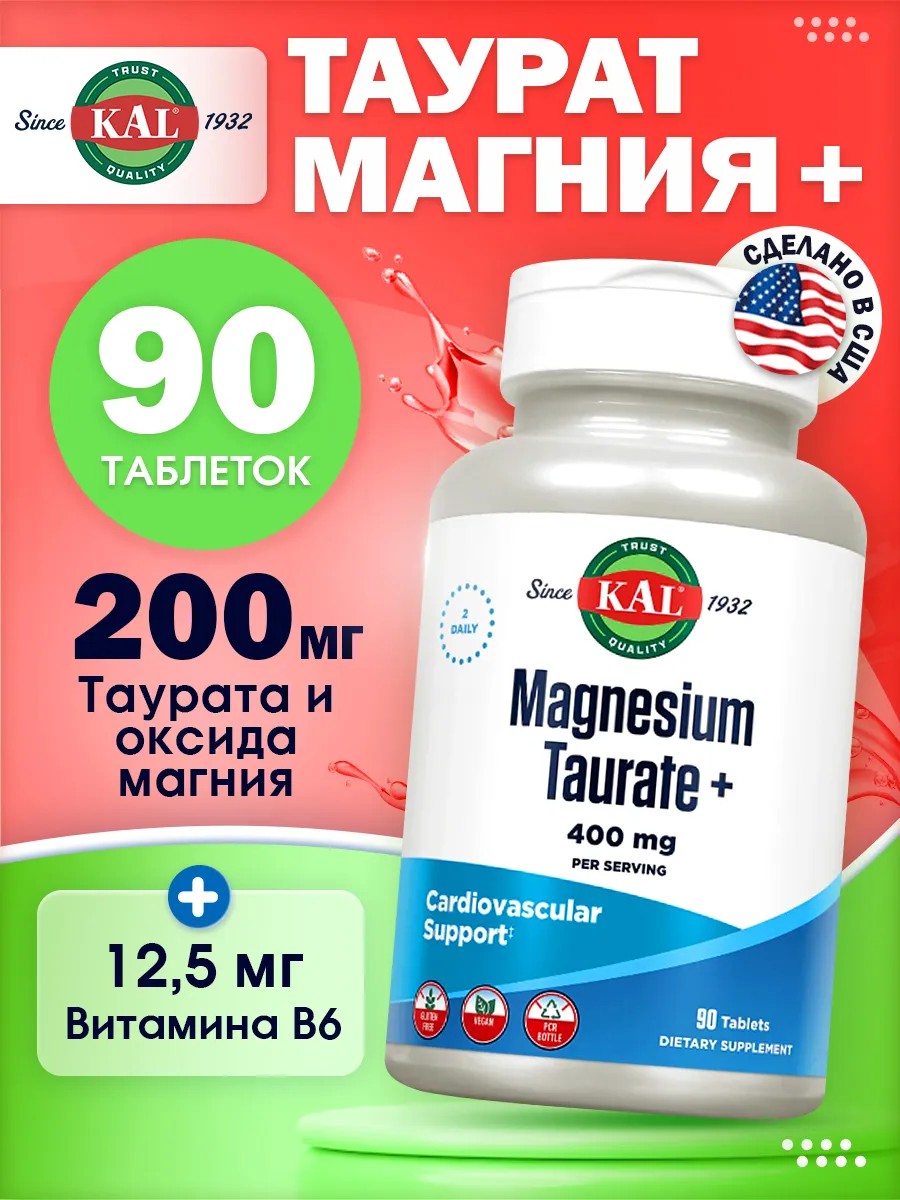 Таурат Магния Плюс, 400 мг в порции, 90 таблеток KAL, Magnesium Taurate+ 90 Tablets 400mg - минерал магний в сочетании со свободной аминокислотой таурином, для нормального здорового функционирования нервной системы и мышц, а также для регуляции здорового потока ионов. ПРЕИМУЩЕСТВА: Таурат Магния Плюс - это уникальный продукт, созданный для обеспечения вашего организма мощным и биодоступным источником магния. Магний является неотъемлемым минералом, необходимым для более чем 300 ферментативных процессов в организме. Однако не все формы магния одинаково эффективны. Таурат магния KAL представляет собой магний, хелатированный с аминокислотой таурин, что делает его особенно эффективным и усваиваемым организмом. Регулярное употребление таурата магния может положительно влиять на здоровье сердечно-сосудистой системы, нервной системы и мышц, включая самую важную мышцу - сердце. Дополнительным преимуществом нашей формулы является присутствие коферментного витамина B-6, который синергически взаимодействует с магнием и способствует образованию красных кровяных телец, а также поддержанию здоровой нервной системы. Наш таурат магния содержит растительную основу ActiSorb, которая повышает его усваиваемость, а также другие полезные компоненты, такие как черный перец, кайенский перец и имбирь, для улучшения эффективности продукта. Кроме того, он не содержит ГМО, подходит для веганов, не содержит основных аллергенов, сои и молочных продуктов. Каждая таблетка проходит лабораторные испытания на эффективность, чистоту и качество. Выберите Таурат Магния Плюс для комплексной поддержки вашего здоровья и уверенности в качестве продукта.