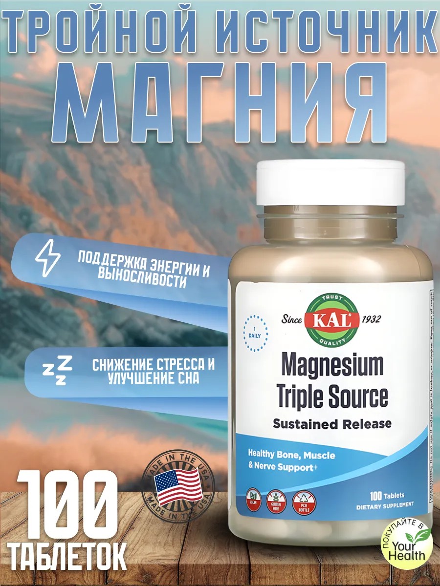 Magnesium Triple Source SR 100 Tablets 500 mg (KAL) is a sustained-release dietary supplement for maintaining the health of adult men and women. Each tablet contains 500 mg of magnesium in three forms (oxide, malate, and citrate) and vitamin B6. This complex helps support immunity and improve heart function. Magnesium has a positive effect on the nervous and muscular systems. It protects the body from the effects of stress, has a calming effect, and restores mental balance. Vitamin B6 has a multifaceted effect on the proper functioning of the nervous system. It helps improve brain function and memory, and also helps reduce stress and improve sleep. In addition, vitamin B6 maintains healthy hair, skin, and nails, making you even more attractive. Magnesium supports healthy bones and joints and improves cardiovascular function. It also regulates appetite and helps manage weight, making it especially beneficial for those trying to lose weight. Magnesium citrate improves magnesium absorption, making the supplement more effective. This multivitamin and mineral complex is a true gift for anyone looking to get the essential micronutrients, vitamins, and minerals their body needs. Magnesium plus vitamin B6 is the ideal solution for adult men and women who lead an active and healthy lifestyle. This comprehensive dietary supplement has a calming and antiviral effect, which is especially important in modern life. Vitamins are indispensable for strengthening both men and women. Magnesium B6 helps improve heart function, dental health, and vision. This vitamin complex is an excellent addition to a sports nutrition program; it helps athletes increase muscle mass and growth, and promotes recovery after sports training. It is also effective in preventing hair loss and fighting depression. A reliable aid for those who care about their health and strive to maintain a healthy figure and beauty. If you are looking for a natural supplement that will help improve overall health, support muscle groups and the heart, and boost immunity and energy, then Magnesium B6 from KAL is your choice. DIRECTIONS: Take 1 tablet daily with a meal or glass of water. Use only as directed. WARNING: Consult a healthcare professional before using dietary supplements if you are undergoing treatment for a medical condition, or if you are pregnant or breastfeeding. Store tightly closed in a dry place, out of reach of children. Protect from direct sunlight.