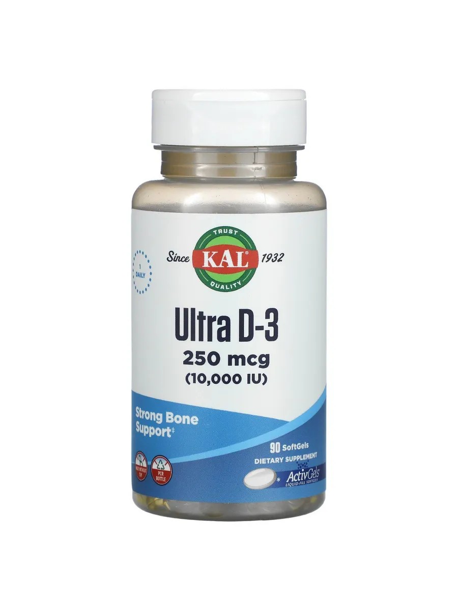 Kal Ultra D-3 10000 IU (250 мкг) ActivGels - это высокодозированная пищевая добавка с витамином D3 в форме ActivGels, обеспечивающая оптимальное усвоение и максимальную биодоступность.Преимущества: Здоровые кости: Витамин D3 необходим для усвоения кальция, который является основным строительным блоком костной ткани, помогая предотвращать остеопороз и поддерживать прочность костей. Укрепление иммунитета: Витамин D3 играет важную роль в поддержании иммунной системы, защищая организм от инфекций и вирусов. Улучшение настроения: Исследования показывают, что витамин D3 может положительно влиять на настроение, снижая риск депрессии и тревожности. Поддержка сердечно-сосудистой системы: Витамин D3 может помочь снизить риск развития сердечно-сосудистых заболеваний, регулируя кровяное давление и уровень холестерина. Улучшение усвоения кальция: Витамин D3 способствует лучшему усвоению кальция, что особенно важно для детей, беременных женщин и пожилых людей. Применение:Принимайте по 1 капсуле в день во время еды или согласно рекомендации врача.Состав:Одна капсула содержит:Витамин D3 (холекальциферол) - 10000 IU (250 мкг)Рекомендации:Проконсультируйтесь с врачом перед началом приема, особенно при беременности, кормлении грудью, наличии хронических заболеваний или приеме других лекарственных средств.Не превышайте рекомендуемую дозировку.Хранить в сухом, прохладном и недоступном для детей месте.Kal Ultra D-3 10000 IU (250 мкг) ActivGels - это эффективная добавка, которая поможет вам поддержать здоровье костей, иммунной системы, а также улучшить настроение и общее самочувствие.