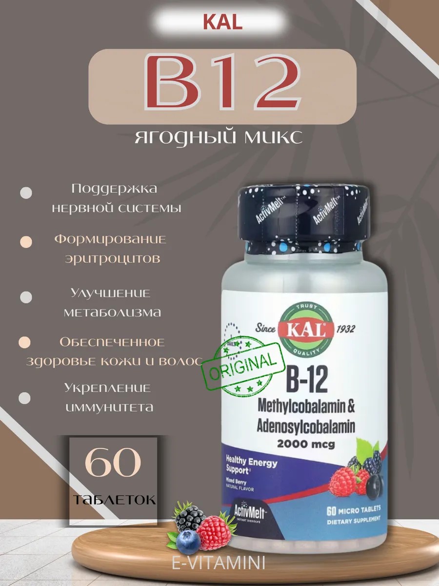 Добавка с витамином B12 ActivMelt от KAL содержит витамин B12 двойного действия в форме метилкобаламина и аденозилкобаламина. Микротаблетки быстро тают во рту и хорошо усваиваются в организме. Добавка имеет просто восхитительный натуральный ягодный вкус. Метилкобаламин и аденозилкобаламин — это биологически активные формы витамина B12. Метилкобаламин преобладает в крови и других жидкостях организма. Аденозилкобаламин — основная форма в клеточных тканях, которая хранится в митохондриях. Вместе они работают синергетическим образом.