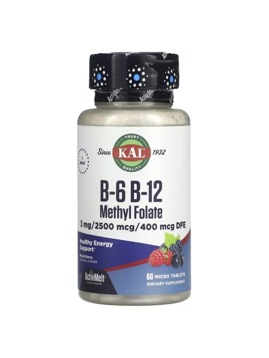 KAL B-6 B-12 Methyl Folate 3 mg/2500 mcg/400 mcg DFE Mixed Berry is a high-quality supplement containing B vitamins, including pyridoxine (B-6), cobalamin (B-12) and methylfolate, which support a healthy nervous system and promote normal metabolism.