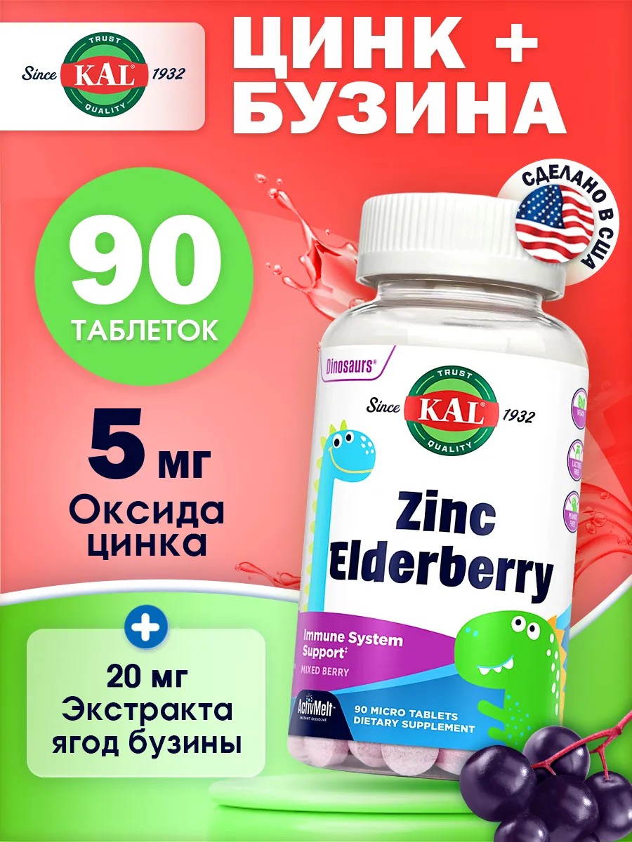 Растворимые таблетки с цинком и бузиной, ягодное ассорти, 90 микротаблеток KAL, Zinc Elderberry ActivMelt 90 Micro Tablets 5 mg - полезный антиоксидант, поддерживает иммунную функцию и общее самочувствие. ПРЕИМУЩЕСТВА цинк для детей с бузиной: инновационный продукт, который объединяет усилия цинка и бузины для защиты здоровья ваших детей. Они предназначены для поддержания костной и иммунной систем, обеспечивают хорошее самочувствие и способствуют естественному развитию. Мы тщательно разработали состав этих жевательных таблеток Dinosaurs, чтобы они содержали все необходимые питательные вещества. Мы заботимся о вашей семье, поэтому качество нашего продукта всегда на высочайшем уровне. Наш продукт имеет ряд преимуществ. Во-первых, таблетки растворяются мгновенно благодаря технологии ActivMelt. Во-вторых, они являются пищевой добавкой и подходят для веганов. И, наконец, они не содержат лактозы и арахиса, что делает их безопасными для использования всеми членами семьи. Выбирайте нашу продукцию с цинком и бузиной, чтобы обеспечить своим детям крепкое здоровье и хорошую защиту иммунной системы. Мы гарантируем, что наши таблетки помогут вашим детям, расти сильными и здоровыми. ПОЛЬЗА: Поддержка иммунитета детей: действуют сверхурочно, в два раза усиливая иммунитет. Плюс их интересно есть! Каждая вкусная таблетка со вкусом ягод содержит 5 мг цинка и 20 мг экстракта бузины для круглогодичной поддержки иммунной системы, на которую могут положиться мамы. Комплексное оздоровление: Добавки с цинком могут играть жизненно важную роль в общей поддержке иммунитета детей. Наши цинковые экстракты из бузины Activmelts сочетают этот важный минерал с экстрактом бузины, который тысячелетиями использовался для поддержания надлежащей иммунной функции. Здоровое развлечение с динозаврами: микротаблетки в форме динозавра с великолепным вкусом мгновенно растворяются и быстро начинают действовать, чтобы ваши малыши были счастливы, здоровы и чувствовали себя наилучшим образом. РЕКОМЕНДАЦИИ ПО ПРИМЕНЕНИЮ: Растворите одну микротаблетку ActivMelt на языке один раз в день. Применять только согласно инструкции. ИНГРЕДИЕНТЫ: Комплекс маннита и крахмала, целлюлоза, полисахариды (соя), натуральный ароматизатор «Ягодное ассорти» и «Ежевика», другие натуральные ароматизаторы (соя), мальтодекстрин, моно- и диглицериды, диоксид кремния, стеарат магния, лимонная кислота, яблочная кислота, бикарбонат натрия и стевия (экстракт листьев). ПРОТИВОПОКАЗАНИЯ: Индивидуальная непереносимость. Проконсультируйтесь с врачом, прежде чем принимать какие-либо пищевые добавки. Не является лекарственным средством. ПРЕДУПРЕЖДЕНИЯ: Хранить в недоступном для детей месте. Не следует превышать рекомендуемую дозировку. Не следует использовать продукт, если наружная защитная пленка повреждена. Хранить в плотно закрытой упаковке в сухом и прохладном месте. Производитель может изменить состав и/или дизайн без уведомления. Это не влияет на качество товара. Мы стараемся обновлять информацию о товарах своевременно.